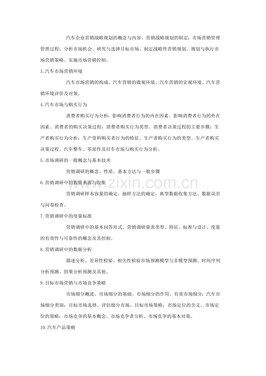 市场营销的含义,市场营销学的性质和研究对象,市场营销观念及其发展。汽车企业战略和市场营销管理过程的含义及其基本内容。汽车企业与市场营销环境的关系,总体环境和个体环境的主要内容,企业对环境影响的对策。购买行为模式理论,影响消费者行为的主要因素,消费者决策过程的主要阶段的特点及相应的营销对策。生产者购买行为的特征,生产者购买行为的类型和生产者购买决策过程。市场细分的一般原理与方法,目标市场策略的运用以及市场定位的含义与策略。分析竞争者的步骤和方法,各类竞争者如何根据企业的竞争地位制订相应的竞争策略。产品的整体概念,产品组合的基本概念,产品经济生命周期原理的基本内容及其对企业的意义,企业对该原理的应用;新产品开发的重要性及新产品开发的程序。影响汽车产品定价的主要因素;汽车企业的定价方法和定价策略。分销渠道的概念和作用,汽车企业的分销渠道策略,汽车产品的仓储与物流配送。影响促销组合的因素,四种促销手段的含义与特点,几种促销策略的主要内容。市场营销计划的内容、市场营销部门的组织形式,以及市场营销实施和控制的过程。