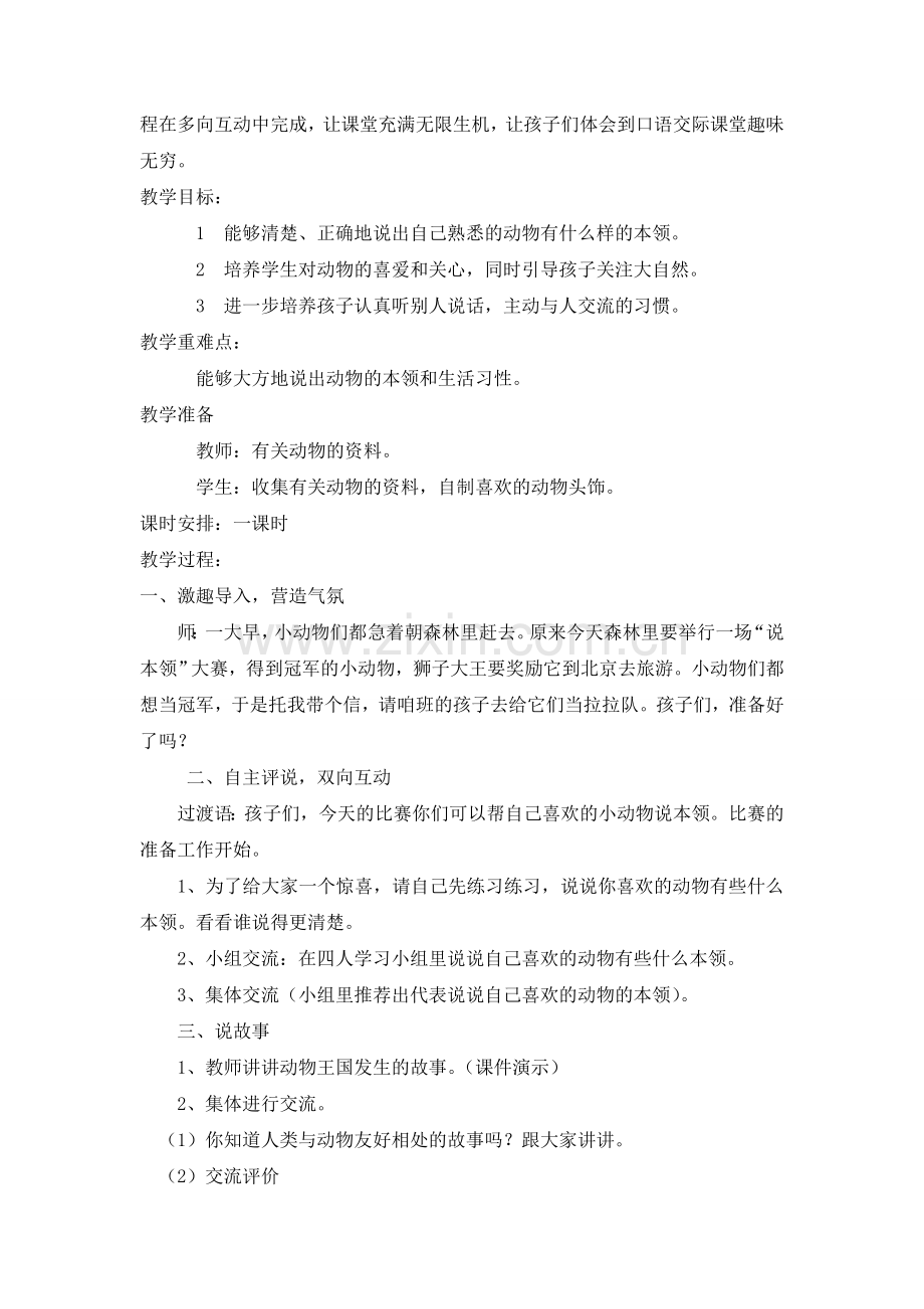 过渡语:孩子们,今天的比赛你们可以帮自己喜欢的小动物说本领。比赛的准备工作开始。