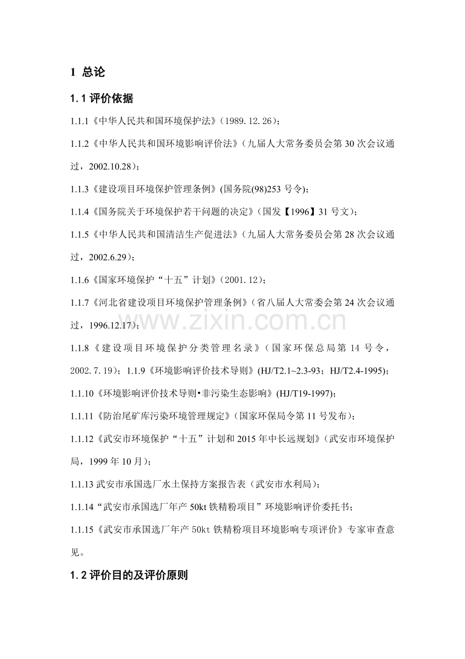 按照国家、省有关建设项目环境保护管理条例的规定和邯郸市环境保护管理部门的要求,该项目需编制环境影响报告表并附专项报告,为此武安市承国选厂委托煤炭工业邯郸设计研究院环保工程所进行该项目的环境影响评价工作。接受委托后,我所立即组织专业人员对该厂及周围环境状况进行了实地踏勘,搜集有关资料,在此基础上编制完成了《武安市承国选厂年产50kt铁精粉项目环境影响专项评价》(报审版)。