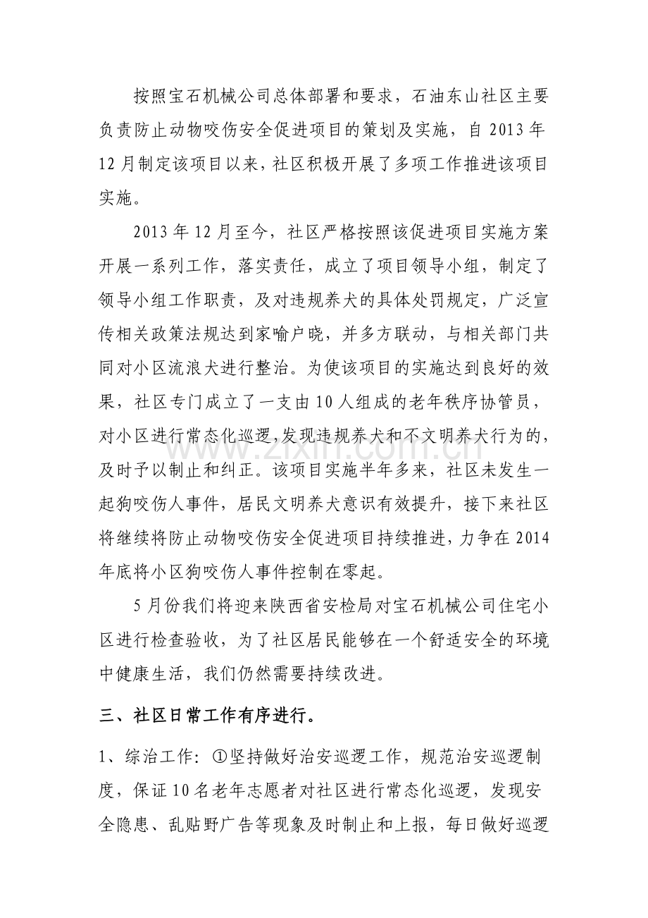 2013年12月至今,社区严格按照该促进项目实施方案开展一系列工作,落实责任,成立了项目领导小组,制定了领导小组工作职责,及对违规养犬的具体处罚规定,广泛宣传相关政策法规达到家喻户晓,并多方联动,与相关部门共同对小区流浪犬进行整治。为使该项目的实施达到良好的效果,社区专门成立了一支由10人组成的老年秩序协管员,对小区进行常态化巡逻,发现违规养犬和不文明养犬行为的,及时予以制止和纠正。该项目实施半年多来,社区未发生一起狗咬伤人事件,居民文明养犬意识有效提升,接下来社区将继续将防止动物咬伤安全促进项目持续推进,力争在2014年底将小区狗咬伤人事件控制在零起。