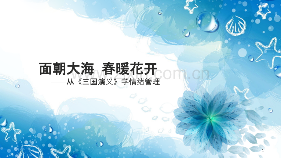面朝大海面朝大海 春暖花开春暖花开 从三国演义学情绪管理1.目录CONTENTS情绪漫谈情绪类型情绪影响如何管理情绪为何管理情绪2.情情绪漫漫谈3.情绪漫谈在我们每个人的身上,都存在这样一种神奇的力量,它可以使你精神焕发,也可以使你萎靡不振;它可以使你冷静理智,也可以使你暴躁易怒;它可以使你安详从容的生活,也可以使你惶惶不可终日。总之,它可以加强你,也可以削弱你,可以使你的生活充满甜蜜与快乐,也可以使你的成活抑郁、沉闷、暗淡无光。这种能使种能使我我们的感受的感受产生生变化的神奇力量,就是情化的神奇力量,就是情绪。4.经典再现刘备全能演员:他能演哥们义气,桃园三结义,五虎将都对他死心塌地;他能演外交专家,袁绍、袁术、曹操、刘表处,处处能来能去;他还是心理专家,既能从别人那里抢地盘,又让别人主动送地盘;该杀他的人总杀不了他,该忠他的人必鞠躬尽瘁。人们常说刘备的江山是哭出来的,但失徐州,投袁绍,附刘表,多少挫折,刘备没有哭,可见其坚强,唯有欲得人心时,男儿泪随叫随到。“哭进天下英才”!5.经典再现曹操一代枭雄:朝堂之上,众官哀哀戚戚,唯独曹操抚掌大笑,笑他们哭不死董卓;渭水之战,被马超所败,幸得诸将解围,曹操却轻描淡写笑说“今日几位小贼所困”;赤壁前夕,宴长江横槊赋诗,略述生平诸事,大笑周郎诸葛无谋。曹操用笑声来驱除失败的痛苦,为垂头丧气、失魂落魄的手下打气,来掩饰自己的失算,维持自己在精神上的优越感,以求自己恢复自己的心理平衡。“幸甚至哉,歌以咏志“!6.经典再现一气诸葛亮先夺荆州;二气“赔了夫人又折兵”;三气讨还荆州不利,再兵败。临死前,他说:“既生瑜,何生亮!”便被自己活活的气死了。一个怀拥当时顶级美女小乔,头顶东吴集团高层光环的男人,却英年早逝,实在令人唏嘘。“东风不与周郎便”!7.情情绪类型型8.情绪类型人的情绪复杂多样,很难有准确的分类。礼记中把人的情绪称为“七情”:喜、喜、怒、哀、惧、怒、哀、惧、爱、恶、欲、欲。近代西方学者认为人的基本情绪分四类:喜、怒、哀、惧喜、怒、哀、惧。情绪活动是无时不在,无处不在的,人人皆有情绪。在现实生活中,我们的行为经常是伴随着情绪反应,所以我们有时会因愤怒而不能自已,以致冲动、急躁、焦虑和抑郁等等。爱恶欲喜怒哀惧今人所分四类古人七情9.情绪分类积极极情情绪消极消极情情绪情绪无好坏之分,由情绪引发的行为或行为的后果有好坏之分,因此,一般我们根据情绪所引发的行为或行为的结果,将情绪划分为积极情极情绪、消极情、消极情绪两大类。开心开心 兴奋苦苦恼 烦躁躁注意:注意:负性情性情绪并不等于消并不等于消极情极情绪10.情情绪影响影响11.情绪影响情绪对正常水平发挥的影响情绪对身体健康的影响积极情绪精力充沛,思维活跃,效率高,能有超水平发挥心情舒畅能防病治病,使人健康长寿消极情绪精力不足,思维迟钝,效率低,发挥失常降低人体的免疫力,容易致病在日常生活中,人们常有这样的体验:高兴时,神清气爽;悲伤时,会食欲不振;忧虑时,会辗转难眠;惊慌时,会心脏乱跳;愤怒时,会热血冲头,这些都说明了情绪会对身体的内部功产生影响。12.图片片中中反反映映的的是是哪哪种种情情绪?13.为何管理情何管理情绪14.控制不了情绪,会造成不可挽回的后果公元193年,曹操已取得兖州,事业得到一定的发展,想把老父曹嵩接过来好好孝敬下。可一方面他思虑不周没有派足够兵前去护送,另一方面曹嵩也太炫富,拉了N多车家财,途中曹嵩全家被张闿劫杀。曹操盛怒之下兴大兵来攻徐州,打着“为父报仇”的旗号连屠十城!后来陈宫、张邈见曹操如此倒行逆施,于是策划了一起集体跳槽事件,迎吕布入主兖州,差点断送曹操基业。攻徐州可谓曹操情绪管理失败的一个经典案例,他在愤怒的情绪下犯了两个错误。首先是出师名不正言不顺;其次是过程不正当,见城就屠。15.恶劣的情绪具有传染性,会产生连锁反应曹操的头风病没人能治,但神医华佗可以,费大力气请来了神医华佗后,华佗说需要把脑袋切开后才能医治,曹操以为他和吉平一样借口医病,实则取他性命,所以曹操把华佗关进大牢,华佗在牢中死了。曹操再次发作的疑心病,害死了华佗,最终自己头风症无人可治,在漫漫头疼之苦中,也带着遗憾离世。做好情做好情绪管理攸关一个人的事管理攸关一个人的事业成成败甚至一生的美甚至一生的美满和幸福。和幸福。所以,我们一定要小心翼翼地处理自己的情绪,做自己情绪的主人。16.如何管理情如何管理情绪17.如何管理情绪情绪能不能管理?很多人认为不能管理,说我就是这个脾气,我也没有办法,我想改就是改不了,这种话我们听太多了。那这样就无从管理了。其实这些都是不正确的,情绪不但可以管理,而且它比其他的事情你的自主性更高,因为我们是自己情绪的真正主宰,我们可以做自己情绪的主人,它跟别人没有太多的关系,它完全是我们自己在决定。曾仕曾仕曾仕曾仕强强大大师观点点18.情绪管理的第一步:察觉自己的情绪若要进行情绪管理,第一步就是第一步就是要正确要正确觉察自己的情察自己的情绪,当我们产生情绪时,表示生活中有事件刺激而至引发警报。于此同时,若我们能察觉到情绪的产生并认知情绪的种类,可以延缓情绪瞬间的爆发,并有针对性的管理