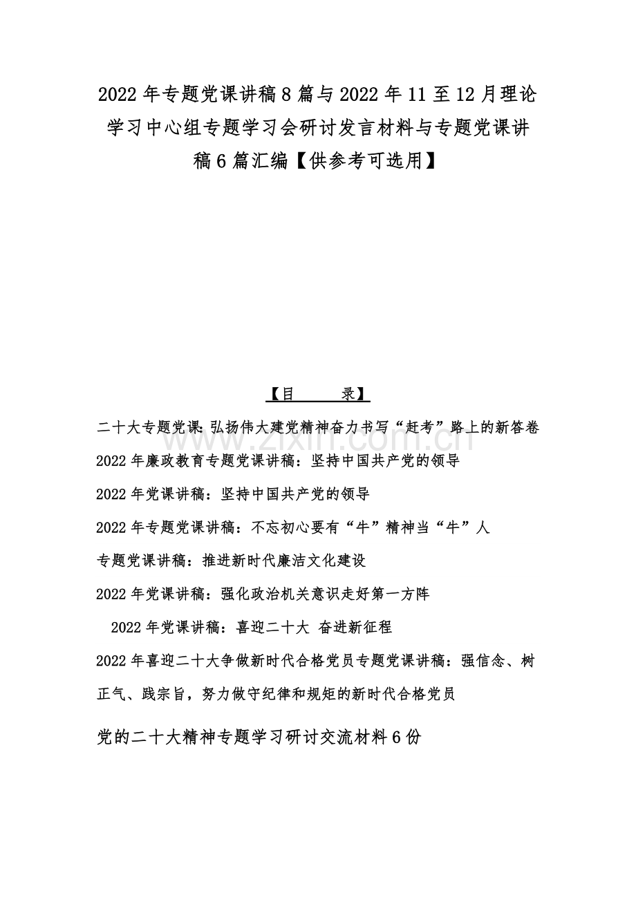 2022年专题党课讲稿8篇与2022年11至12月理论学习中心组专题学习会研讨发言材料与专题党课讲稿6篇汇编【供参考可选用】
