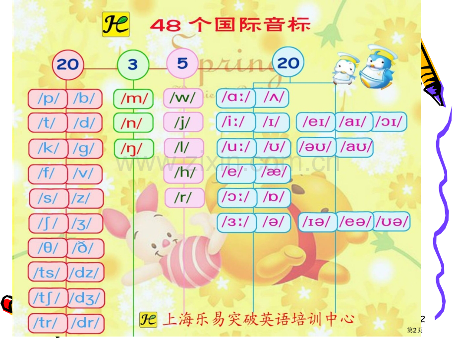 乐易突破英语乐易突破英语音标速成音标速成1第1页2第2页3拼读规则1:元+辅,各读各音/p b t d/k g f v/3第3页拼读规则2:辅+元,二者相拼 /p b t d/k g f v/4第4页拼读规则3:辅+元+辅 先辅元,再顺延 /b g/l p/p d/m p/k t/m n/d d/s d/b t/f t/t p/n p/f n/g p/h t/5第5页拼读规则3:多辅多元(多音节)先找元,再辅元,再相连,重音符号是关键。一拍拼读,二拍连读,三拍重音一拍拼读,二拍连读,三拍重音 6第6页Lets challenge!/f ml/psblt/fms/hspt lt/kmptn/sntmnt lt/rvln/7第7页 乐易歌谣乐易歌谣One two three,向前走。向前走。Four five six,别回头。别回头。Seven eight,拍拍手。拍拍手。Nine ten,咱们吼一吼。咱们吼一吼。One two three,Go go go!8第8页