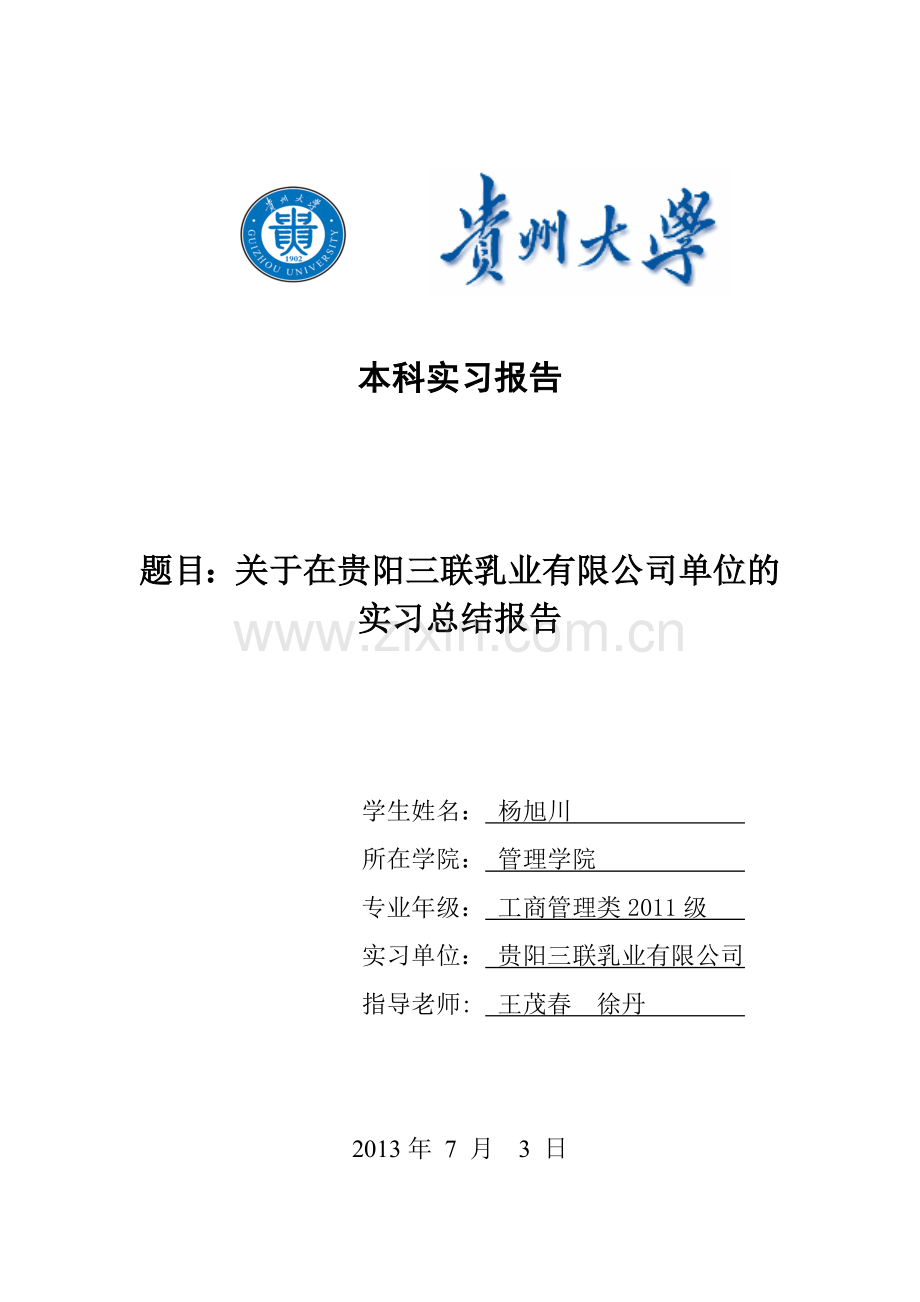 题目:关于在贵阳三联乳业有限公司单位的实习总结报告