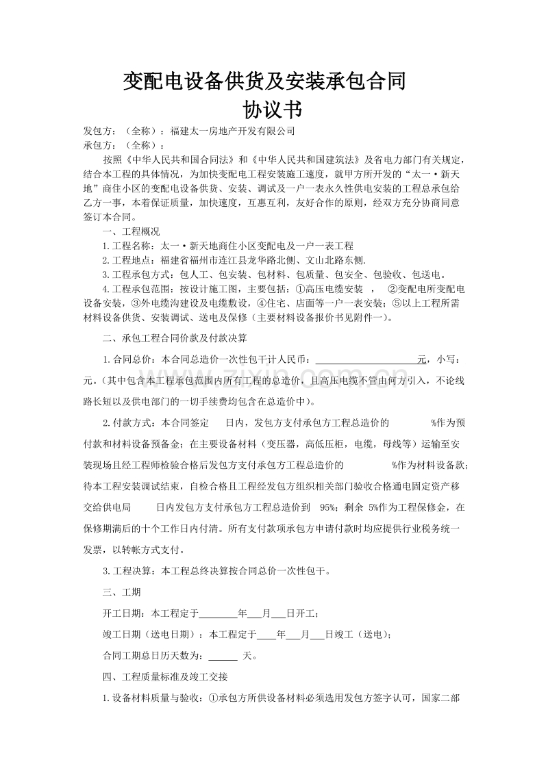 按照《中华人民共和国合同法》和《中华人民共和国建筑法》及省电力部门有关规定,结合本工程的具体情况,为加快变配电工程安装施工速度,就甲方所开发的“太一新天地”商住小区的变配电设备供货、安装、调试及一户一表永久性供电安装的工程总承包给乙方一事,本着保证质量,加快速度,互惠互利,友好合作的原则,经双方充分协商同意签订本合同。