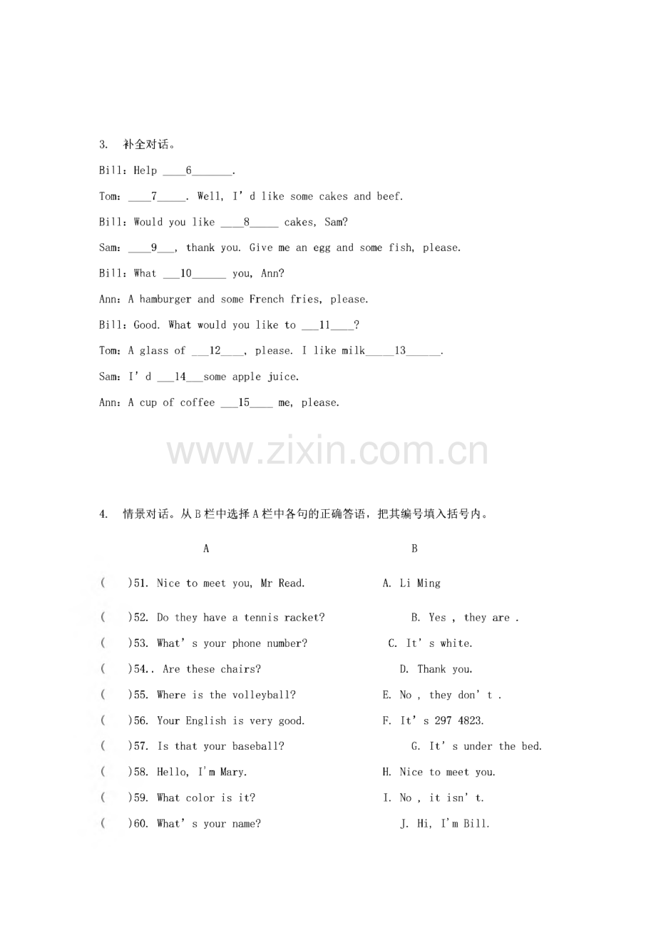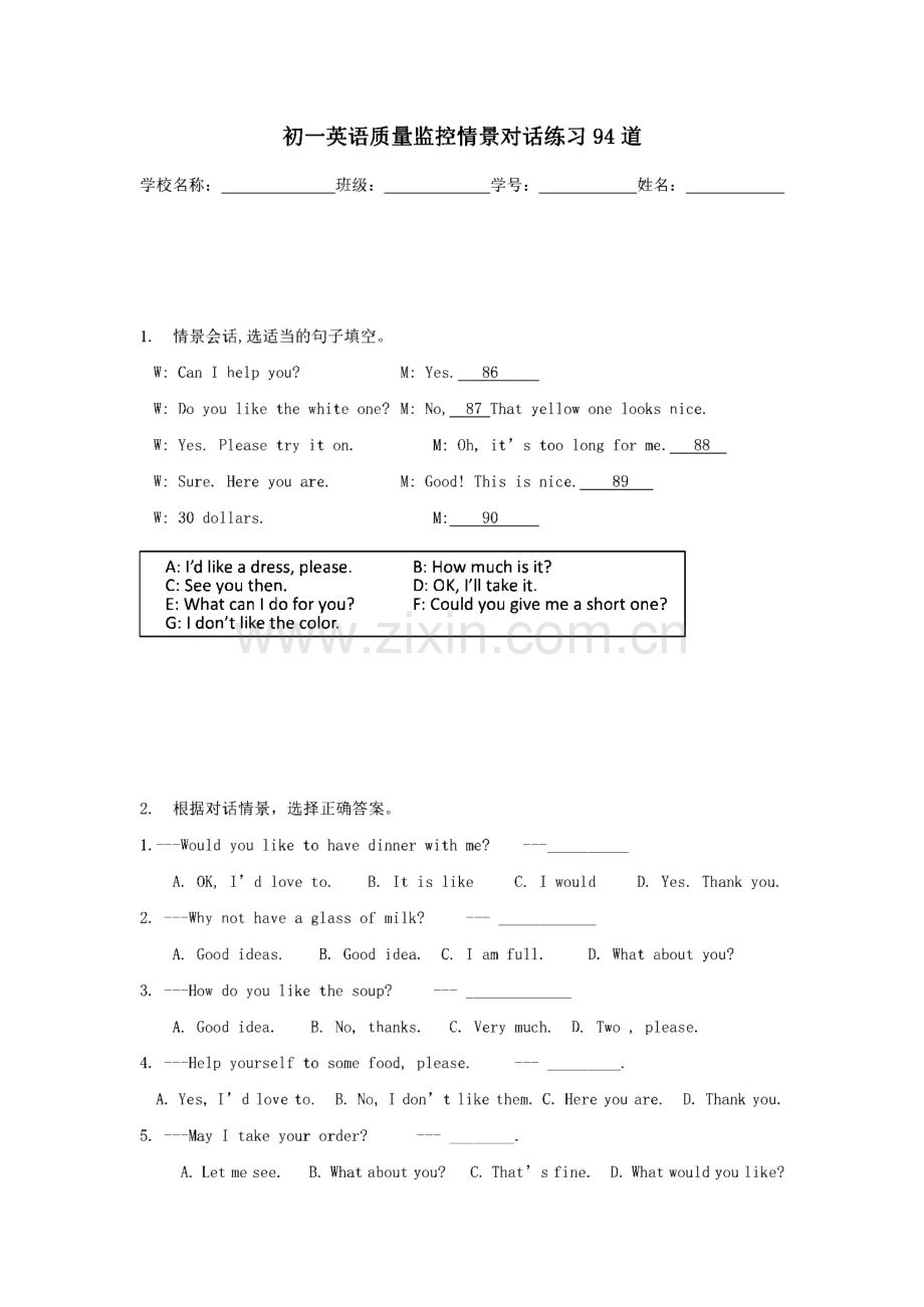 初一英语质量监控情景对话练习94道学校名称:班级:学号:姓名:1.情景会话,选适当的句子填空。W:Can I help you?M:Yes.86W:Do you like the white one?M:No,87 That yellow one looks nice.W:Yes.Please try it on.M:Oh,it s too long for me._88W:Sure.H ere you are.M:Good!This is nice.89W:30 dollars.M:90A:Id like a dress,please.B:How much is it?C:See you then.D:OK,Ill take it.E:What can 1 do for you?G:1 dont like the color.F:Could you give me a short one?2.根据对话情景,选择正确答案。1.Would you like to have dinner with me?-A.OK,I d love to.B.It is like C.I would D.Yes.Thank you.2.Why not have a glass of milk?-A.Good ideas.B.Good idea.C.I am full.D.What about you?3.H ow do you like the soup?-A.Good idea.B.No,thanks.C.V ery much.D.Two,please.4.H elp yourself to some food,please.-.A.Yes,I d love to.B.No,I don,t like them.C.H ere you are.D.Thank you.5.May I take your order?-.A.Let me see.B.What about you?C.That s fine.D.What would you like?3.补全对话。Bill:H elp 6.Tom:7.Well,I d like some cakes and beef.Bill:Would you like 8 cakes,Sam?Sam:9_,thank you.Give me an egg and some fish,please.Bill:What _10 you,Ann?Ann:A hamburger and some F rench fries,please.Bill:Good.What would you like to _11?Tom:A glass of_12,please.I like milk 13.Sam:I d _14_some apple juice.Ann:A cup of coffee _15 me,please.4.情景对话。从B栏中选择A栏中各句的正确答语,把其编号填入括号内。AB)51.Nice to meet you,Mr Read.)52.Do they have a tennis racket?)53.What s your phone number?A.Li MingB.Yes,they are.C.It s white.)54.Are these chairs?)55.Where is the volleyball?)56.Your English is very good.)57.Is that your baseball?)58.H ello,Im Mary.)59.What color is it?)60.What s your name?D.Thank you.E.No,they don t.F.It s 297 4823.G.It s under the bed.H.Nice to meet you.I.No,it isn t.J.H i,fin Bill.5.完成对话,每空一词A:Wu Lin,look at the picture.B:She s my new friend.A:2B:Sue Green.A:And who s that man?3B:Yes,you re right.And the woman is her mother.A:4B:Yes,he is.And that s their cat.A:5B:Yes.It s Mimi.A:Ah,what a nice cat and what a nice name!A.Is he her father?B.Who s that girl?C.Is the boy her brother?D.Do you know its name?E.What s her name,please?1.2.3.4.5.6.情景交际:选择方框内的句子完成对话(一项多余)A.It says it s going to rain.B.See you at 8:00 tomorrow morning.C.I know the weather is not bad.D.Tomorrow is not a good day for a picnic!E.But how can we get there?F.Why not come to my home to have a party?A:H i,Maria!A nice day,isn,t it?B:Yes,What about going out for a picnic tomorrow?A:Tomorrow?B:Why?A:I listened to the weather report.B:What a pity!If it rain,I m afraid we will have to stay at home.A:I 11 ask Mary and Jim,too.B:Great!A:My home is quiet near here.Just walk along this road to the end.You 11 find a white house on your left.That is my house.B:Ok!_Orders(顺序):7.情景交际。根据对话所提供的情景,括号内,使对话意思完整正确。A:Excuse me,1B:Let me have a look._2I think it s Lily,s.A:Lily,is that coat yours?C:3_(A:It s grey.C:4 I can t find it.A:It s over there.Put it on,C:5(在下列7个选项中选择5句,将其序号填在相应的)A.What colour is it?()B.Youre welcome.C.Whose coat is it?D.Oh,its not mine.E.Thank you very much.)F.1 cant find my coat.G.1 think its mine.()please.)8.情景对话。从B栏中选择A栏中各句的正确答语,把其编号填入括号内。BA()1.Doyouhave agoldring?A.No,(they aren t.)2.Isthatawatch?B.It,(s my sister.)3.What,syour phonenumber?C.It,(s white.)4.Let)s playbasketball.A.Lets play volleyball together(一起).B.But I don,t like to play football.C.Hi!Nice to meet you,too.D.Do you like sports?E.It sounds good.D.Thank you.()5.Where is the volleyball?()6.Your English is very good.()7.Can you spell clock?()8.Who,s that girl?()9.What color is it?()10.Are these her baseball bats?E.That sounds good.F.It,s 2974823.G.It s under the bed.H.Yes,I do.I.Yes,it is.J.C-L-O-C-K.9.情景会话,选择正确答案A:H ello,Mike!Nice to meet you.B:1_,Tony!A:Oh,you have a volleyball!_2_.B:Yes,I do.I like volleyball,_3_.Its too difficult.A:I like to play football._4_.And I like volleyball,too.B:Do you join volleyball club?A:Yes,I do.B:I join volleyball club,too._5.A:All right.1.2.3.4.5.10.情景交际从B栏中找出A栏各句的答语,将字母填在括号内()56、A、What s this in English?a.No,they aren t()57、A、Is this your box?b.Blackboard()58、A、Are these your pencils?c.Maria()59、A、Who s this?d.No,it isn t()50、A、What s her first name?e.This is my grandfather.11.完成下列对话Kate:H ello,David.David:61,Kate,H ow 62 you?Kate:63,thank you.64 is Joy?David:She s fine,too,65 you?Kate:66 she at home?David:Yes,67 68.Kate:Please say hello to her(向她问好)Dav id:OK.69 you.Kate:Goodbye.See you later.David:See 70.6K 62、63、64、65、66、67、68、69、70、12.情景交际从A、B、C、D四个选项选择最佳答案,将其序号填在括号内。()47、当别人赞扬你的英语不错时,你应该说A、No,no B、No,I can t C、Thank you D Sorry()48、初次与人相识的问语是A、H ow do you do?B、H ow are you?C、H ow old are you?D、What s you name?()49、对于上了年纪的人,我们不要问A、H ow are you?C、H ello!()50、问对方是念哪一年级时说A、What class are you in?C、What row are you in?B、Nice to meet you.D、H ow old are you?B、What s grade are you in?D、Whar grade are you in?()51、面对刚到你家做客的客人,你应该说A、You re welomeB、Thank youC、Welcome to my homeD、See you later13.根据所提供情景选择适当的句子:(5分)()1.早上见到老师应该怎样问好?A.H ello!B.Good morning!C.H ow are you?()2.当你不知道某物为何物时,应问:A.Whats name?B.H ow are you?C.Whats this?()3.在放学路上两位同学见了面,应说:A.H ello!B.Good morning!C.H ow are you?()4.如果你想要别人的答语是“F ine,thank you.,应问:A.H ello!B.Whats this?C.H ow are you?()5.如果你想知道别人的名字,