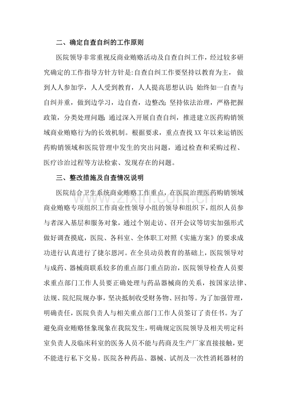医院领导非常重视反商业贿赂活动及自查自纠工作,经过较多研究确定的工作指导方针方针是:自查自纠工作要坚持以教育为主, 做到人人参加学,人人受到教育,人人提高思想认识;始终如一自查与自纠并重,做到边学习,边自查,边整改;坚持依法治理,严格把握政策,分类处理问题;通过深入开展自查自纠,推进建立医药购销领域商业贿赂行为的长效机制。根据要求,重点查找XX年以来运销医药购销领域和医院管理中发生的突出问题,通过检查和采购过程、 医疗诊治过程等方法检索、发现存在的问题。