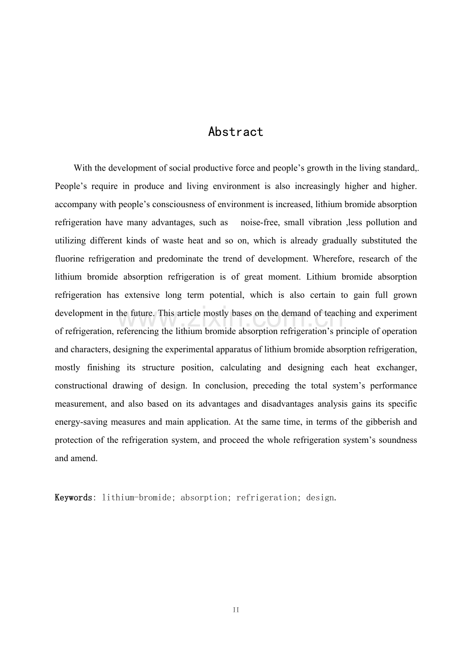 在制冷空调设计中,最常用的冷水机组就是溴化锂吸收式制冷机组及电动压缩式制冷机组。然而由于国际上对氯氟烃化物的限用,电动压缩式制冷机在工程上越来越少,目前,大多数设计者首选均采用溴化锂吸收式制冷机。本文将具体介绍溴化锂吸收式制冷机的发展前景,工作原理,设计方法和设计步骤,性能分析等,由于本设计是小型溴化锂吸收式制冷实验装置,要求精确度较低,对于教学和实验有很好的帮助和指导意义。[1]