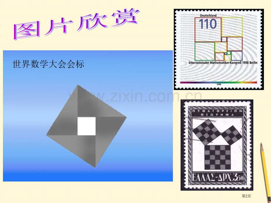19.2.3 19.2.3 正方形正方形第1页世界数学大会会标第2页第3页第4页第5页第6页第7页第8页第9页第10页 创设情景创设情景情景一情景一问题问题:从这个图形中你想到了什么?从这个图形中你想到了什么?第11页A AB BC CD D第12页A AB BC CD D第13页A AB BC CD D第14页A AB BC CD D第15页A AB BC CD D第16页A AB BC CD D第17页A AB BC CD D第18页A AB BC CD D第19页A AB BC CD DA AB B情景二情景二当当当当CDCD移动到移动到移动到移动到 位置,且位置,且位置,且位置,且 时,此时,此时,此时,此时图形还是矩形吗?时图形还是矩形吗?时图形还是矩形吗?时图形还是矩形吗?图中图中图中图中CDCDCDCD在移动时,这个图形一直是怎样图形?在移动时,这个图形一直是怎样图形?在移动时,这个图形一直是怎样图形?在移动时,这个图形一直是怎样图形?(CDCDCDCD在移动过程中一直保持与在移动过程中一直保持与在移动过程中一直保持与在移动过程中一直保持与ABABABAB平行)平行)平行)平行)第20页邻边相等邻边相等矩形矩形想一想:正方形是怎样矩形?想一想:正方形是怎样矩形?矩形矩形正方形正方形第21页菱形菱形正方形正方形一个角是直角菱形一个角是直角菱形想一想:正方形是怎样菱形?想一想:正方形是怎样菱形?第22页两组两组对边对边分别分别平行平行有一个角有一个角是直角是直角有一组邻有一组邻边相等边相等四边形四边形平行四平行四边形边形矩形矩形菱菱形形第23页平行四边形平行四边形正方形正方形矩形矩形菱形菱形一组邻边相一组邻边相等等一组邻边相一组邻边相等等一内角是直一内角是直角角一内角是直一内角是直角角平行四边形平行四边形正方形正方形一组邻边相等一组邻边相等一内角是直角一内角是直角定义:定义:一组一组邻边相等邻边相等,且有,且有一个角是直角一个角是直角平行四边形平行四边形叫做叫做正方形正方形第24页菱形菱形矩形矩形平行四边形平行四边形正正形形方方平行四边形,矩形,菱形,正方形关系平行四边形,矩形,菱形,正方形关系 正方形是特殊平行四边形,也是特殊矩形,正方形是特殊平行四边形,也是特殊矩形,也是特殊菱形。也是特殊菱形。第25页第26页回顾回顾平行四边形平行四边形,矩形矩形,菱形菱形性质,性质,完成表格前三列完成表格前三列平行四平行四边形边形矩矩 形形 (所特有所特有)菱形菱形 (所特有所特有)边边角角对角线对角线图形对称性对边平行对边平行且相等且相等四条边相等四条边相等对边平行对边平行且且四条边相等四条边相等对角相等对角相等四个角都四个角都是直角是直角四个角都四个角都是直角是直角对角线相对角线相互平分互平分对角线对角线相等相等对角线对角线相互相互垂直垂直,每条,每条对角线平分对角线平分一组对角一组对角对角线对角线相等相等且且相相互垂直平分互垂直平分,每,每条对角线平分一条对角线平分一组对角组对角中心对称中心对称图形图形既是既是中心对中心对称图形称图形又是又是轴对称图形轴对称图形既是既是中心对中心对称图形称图形又是又是轴对称图形轴对称图形既是既是中心对中心对称图形称图形又是又是轴对称图形轴对称图形图形性质分类正方形正方形第27页对角线:对角线:相等相等 相互垂直平分相互垂直平分 每条对角线平分一组对角。每条对角线平分一组对角。边边:对边平行对边平行 四边相等四边相等角角:四个角都是直角四个角都是直角图形对称性:图形对称性:既是轴对称图形既是轴对称图形,又是中心对称图形又是中心对称图形.第28页 你以为什么样四边形是正你以为什么样四边形是正方形呢方形呢?(?(判断一个四边形是判断一个四边形是正方形有哪些方法?)正方形有哪些方法?)第29页平行四边形平行四边形正方形正方形一组邻边相等一组邻边相等一内角是直角一内角是直角1 1、正方形正方形菱形菱形 2 2、一内角是直角一内角是直角矩形矩形3 3、一组邻边相等一组邻边相等正方形正方形正方形判定方法:正方形判定方法:(可从平行四边形、矩形、菱形为基础)可从平行四边形、矩形、菱形为基础)定义法定义法菱形法菱形法矩形法矩形法第30页四条边相等,四个角都是直角四条边相等,四个角都是直角对角线相互垂直、平分且相等对角线相互垂直、平分且相等四边形四边形正方形正方形以四边形为基础:以四边形为基础:既是菱形又是矩形四边形是正方形既是菱形又是矩形四边形是正方形。第31页第32页对边平行且相等对边平行且相等每条对角线平分每条对角线平分一组对角一组对角对角线相等对角线相等对角线相互垂直对角线相互垂直对角线相互平分对角线相互平分四个角都是直角四个角都是直角对角相等对角相等四条边都相等四条边都相等性质性质正方形正方形菱形菱形矩形矩形平行四平行四边形边形图形图形小结小结第33页5种识种识别方法别方法三个角是直角三个角是直角四条边相等四条边相等一个角是直角一个角是直角或或对角线相等对角线相等一组邻边相等一组邻边相等或或对角线垂直对角线垂直一组邻边相等一组邻边相等或或对角线垂直对角线垂直一个角是直角一个角是直角或或对角线相等对角线相等一个角是直角且一组邻边相等一个角是直角且一组邻边相等平行四边形、矩形、菱形、正方形判定小结平行四边形、矩形、菱形、