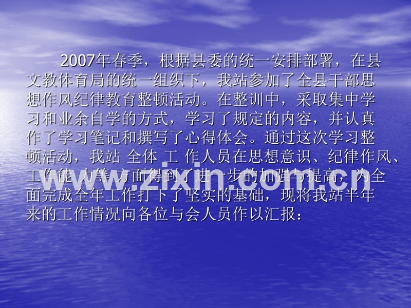 半年工作总结及下半年工作打算,2007年春季,根据县委的统一安排部署,在县文教体育局的统一组织下,我站参加了全县干部思想作风纪律教育整顿活动。在整训中,采取集中学习和业余自学的方式,学习了规定的内容,并认真作了学习笔记和撰写了心得体会。通过这次学习整顿活动,我站全体工作人员在思想意识、纪律作风、工作能力等方面得到了进一步的加强与提高,为全面完成全年工作打下了坚实的基础,现将我站半年来的工作情况向各位与会人员作以汇报:,信息化方面:,1、根据省、市项目办的文件精神,我站认真、扎实安排了全县各中小学教师寒假期间远程教育应用集中研训,我站人员分片下乡对研训工作进行了检查,市电教馆也派员对我县研训情况进行了检查指导,确保研训收到实效。,2、我站技术人员分片下乡,全面了解各项目学校的设备管理、运行情况并及时解决故障问题,保证开学正常使用。,3、对全县完全小学以上学校技术骨干进行了卫星资源应用管理软件的培训。,4、征集师生课件、网页、论文,为市、省相应活动选拔优秀作品。5、完成了现代教育技术实验学校高中段电教教材的征订及审验工作。6、完成了远教项目申报及07年信息化建设项目前期准备工作。7、根据文教体育局的安排,我站工作人员同县教研室教研员下乡检查各学校双常规工作,并对卫星资源应用管理软件的应用情况作了了解、指导。8、组织模式三学校副校长参加市上培训及县技术骨干参加省级培训。9、组织首批汉中市信息化示范学校的申报工作。10、组织上报三种模式课堂实录各两节。11、完成了省、市电教部门交办的临时性工作。,宣传工作:,1、加大了宣传力度,对我县新学期开学工作、各小学“庆六一”等活动作了综和报道。2、配合我县文教体局做好各项教育宣传,充分利用县有线电视及留坝教育网进行宣传,宣传工作作到及时准确。,“两基”迎国检工作:,1、制定了我县“两基”迎国检宣传工作方案,承担了“两基”迎国检工作全盘宣传报道工作。2、制作了我县“两基”迎国检工作专题片《紫柏春晖》的编辑制作工作。3、完成了我县县人民政府、文教体育局“两基”巩固提高工作情况汇报的PPT制作工作。4、完成了我县“两基”工作展板的制作,并负责对各乡镇、学校展板制作的指导、验收工作。,5、负责编印我县“两基”工作简报16期(稿件收集、文字处理、编排、印刷等工作),还主办了两期“两基”工作宣传黑板报。6、完成县教体局交办的临时性工作。,下半年主要工作思路,作好全县07年项目学校设备接收、安装、培训等前期有关准备工作。深入学校检查、督促课题研究工作。举行一次课题研究、阶段性总结、研究报告的撰写培训会。配合防雷部门作好项目学校防雷安全检测工作.继续做好新闻宣传报道工作(教师节、国庆节)。征集师生课件、论文、网页。远教设备、管理与维护。举办全县教育信息化创新与成果评选活动。对各校教育信息化工作评估考核。制作2007年教育大事回顾专题片。全年工作总结。,谢谢大家!,