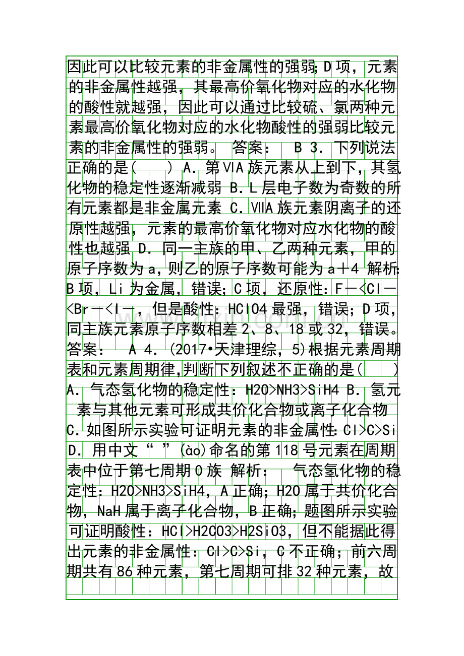 专题突破练(五) 物质结构和元素周期律 1.据腾讯科技报道:日本科学家合成了第113号元素,并获得国际机构确认。关于该元素的有关说法错误的是( ) A.该元素的单质可用作半导体材料 B.该元素一种同位素的质量数为A,则中子数为A-113 C.该元素的最高正化合价为+3 D.该元素位于元素周期表中第七周期第ⅢA族 解析: 元素周期表排满时有118种元素,第118号元素位于第七周期0族,故该元素位于第七周期第ⅢA族,D项正确;根据元素递变规律推断该元素为金属元素,其单质为导体,A项错误;根据质子数+中子数=质量数,可知该同位素的中子数为A-113,B项正确;该元素位于第ⅢA族,最高正化合价为+3,C项正确。 答案: A 2.不能作为判断硫、氯两种元素非金属性强弱的依据是 ( ) A.单质氧化性的强弱 B.单质沸点的高低 C.单质与氢气化合的难易 D.最高价氧化物对应的水化物酸性的强弱 解析: A项,元素的非金属性越强,其单质获得电子的能力就越强,因此单质氧化性就越强,故可以通过比较单质氧化性的强弱,判断元素的非金属性的强弱;B项,S单质、Cl2都是分子晶体,分子之间通过分子间作用力结合,分子间作用力越大,物质的熔、沸点就越高,这与元素的非金属性强弱无关;C项,元素的非金属性越强,其单质与氢气化合形成氢化物就越容易,形成的氢化物的稳定性就越强,因此可以比较元素的非金属性的强弱;D项,元素的非金属性越强,其最高价氧化物对应的水化物的酸性就越强,因此可以通过比较硫、氯两种元素最高价氧化物对应的水化物酸性的强弱比较元素的非金属性的强弱。 答案: B 3.下列说法正确的是( ) A.第ⅥA族元素从上到下,其氢化物的稳定性逐渐减弱 B.L层电子数为奇数的所有元素都是非金属元素 C.ⅦA族元素阴离子的还原性越强,元素的最高价氧化物对应水化物的酸性也越强 D.同一主族的甲、乙两种元素,甲的原子序数为a,则乙的原子序数可能为a+4 解析: B项,Li为金属,错误;C项,还原性:F-<Cl-<Br-<I-,但是酸性:HClO4最强,错误;D项,同主族元素原子序数相差2、8、18或32,错误。 答案: A 4.(2017•天津理综,5)根据元素周期表和元素周期律,判断下列叙述不正确的是( ) A.气态氢化物的稳定性:H2O>NH3>SiH4 B.氢元素与其他元素可形成共价化合物或离子化合物 C.如图所示实验可证明元素的非金属性:Cl>C>Si D.用中文“ ”(ào)命名的第118号元素在周期表中位于第七周期0族 解析: 气态氢化物的稳定性:H2O>NH3>SiH4,A正确;H2O属于共价化合物,NaH属于离子化合物,B正确;题图所示实验可证明酸性:HCl>H2CO3>H2SiO3,但不能据此得出元素的非金属性:Cl>C>Si,C不正确;前六周期共有86种元素,第七周期可排32种元素,故118号元素在第七周期0族,D正确。 答案: C 5.短周期元素Q、W、X、Y、Z在元素周期表中的相对位置如图所示,其中只有Z为金属元素。则下列说法中,正确的是( ) A.W、X两种元素在自然界中都存在相应的单质 B.Q、Y分别与活泼金属元素形成的化合物中仅含离子键 C.Y、Z分别形成的简单离子中,前者的半径较大 D.X、Z的最高价氧化物对应的水化物之间容易相互发生反应 解析: 由元素所在周期表中的位置可知,X为C元素,Y为O元素,Z为Al元素,W为Si元素,Q为Cl元素。A项,W为Si元素,X为C元素,C在自然界中存在单质,Si为亲氧元素,在自然界中全部以化合态存在,故A错误;B项,Y为O元素,Q为Cl元素,O与活泼金属形成的化合物中可能含有共价键,如过氧化钠中存在离子键和共价键,故B错误;C项,电子排布相同的离子,原子序数越大,离子半径越小,则O、Al分别形成的简单离子中,前者的半径较大,故C正确;D项,X为C元素,Z为Al元素,C的最高价氧化物的水化物为弱酸,与氢氧化铝不反应,故D错误。 答案: C 6.部分短周期元素原子半径的相对大小、最高正价或最低负价随原子序数的变化关系如图所示: 下列说法正确的是( ) A.离子半径的大小顺序:e>f>g>h B.与x形成简单化合物的沸点:y>z>d C.x、z、d三种元素形成的化合物可能含有离子键 D.e、f、g、h四种元素对应最高价氧化物的水化物相互之间均能发生反应 解析: 根据题意可推出x、y、z、d、e、f、g、h分别为H、C、N、O、Na、Al、S、Cl。S2-和Cl-有三个电子层,而Na+和Al3+只有两个电子层,故离子半径大小顺序为S2->Cl->Na+>Al3+,A项错误;CH4、NH3、H2O中,H2O在常温下呈液态,沸点最高,B项错误;H、N、O形成的化合物NH4NO3为离子化合物,NH4NO3中既含离子键又含共价键,C项正确;HClO4与H2SO4不能发生反应,D项错误。 答案: C 7. W、X、Y、Z是四种常见的短周期元素,其原子半径随原子序数变化如右图所示。已知W的一种核素的质量数为18,中子数为10;X和Ne原子的核外电子数相差1;Y的单质是一种常见的半导体材料;Z的非金属性在同周期元素中最强。下列说法不正确的是( ) A.对应简单离子半径:X<W B.对应简单气态氢化物的稳定性:Y<Z C.化合物XZW既含离子键也含共价键 D.Y的氧化物能与Z或X的最高价氧化物对应的水化物反应 解析: 根据题目所给信息可推出W为O,X为Na,Y为Si,Z为Cl。根据核外电子数相同的简单离子,原子序数越大,半径越小可知,对应简单离子半径Na+<O2-,A项正确;元素的非金属性越强,其简单气态氢化物越稳定,故HCl的稳定性强于SiH4,B项正确;NaClO为离子化合物,Na+和ClO-之间为离子键,氯原子和氧原子之间为共价键,C项正确;SiO2可以与NaOH溶液反应生成盐和水,但和HClO4不反应,D项错误。 答案: D 8.(2017•江苏高考,5)短周期主族元素X、Y、Z、W原子序数依次增