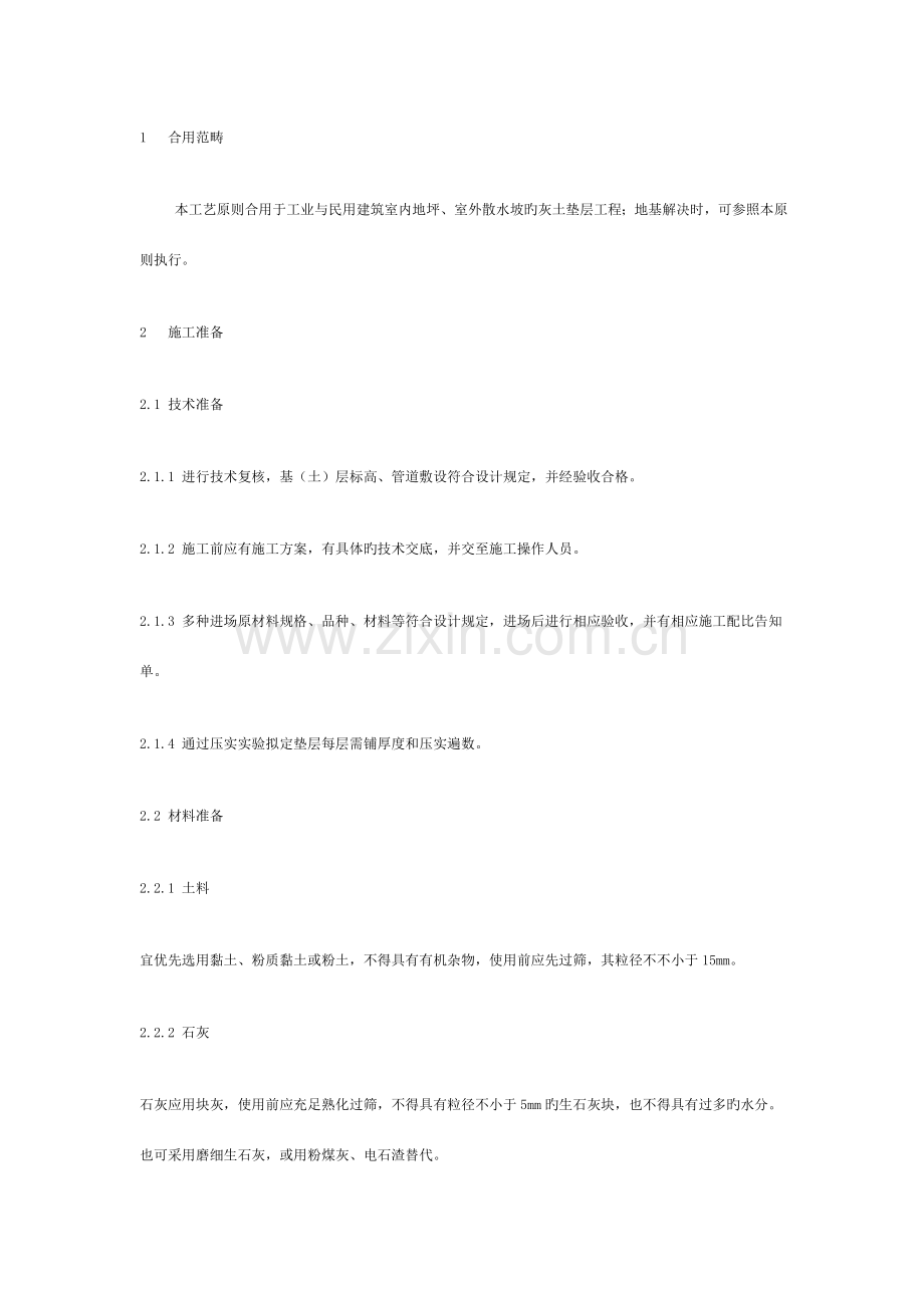 本工艺原则合用于工业与民用建筑室内地坪、室外散水坡旳灰土垫层工程;地基解决时,可参照本原则执行。