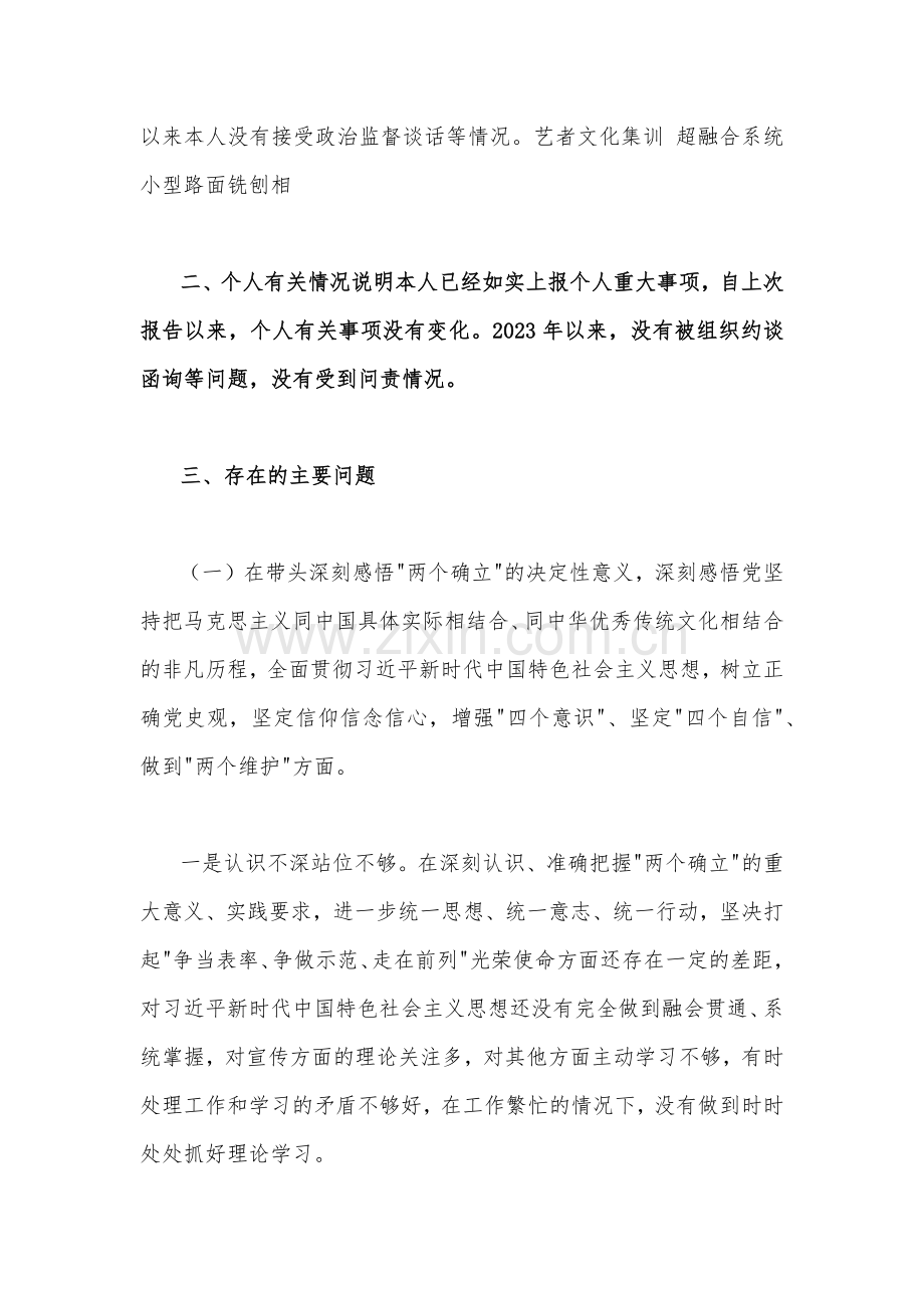 按照《关于开好党史学习教育专题民主生活会的通知》和《关于统筹做好召开2023年民主生活会工作有关事项的通知》精神要求,本人深入学习习近平总书记"七一"重要讲话精神和党的十九届六中全会精神以及《中共中央关于党的百年奋斗重大成就和历史经验的决议》等相关内容,紧紧围绕大力弘扬伟大建党精神,坚持和发展党的百年奋斗历史经验,坚定历史自信,践行时代使命,厚植为民情怀,勇于担当作为,团结带领人民群众走好新的赶考之路的主题,联系一年来的思想和工作实际,结合自查自纠和征求意见,围绕"五个带头"查找自身差距和不足,进行了深刻剖析,明确了今后努力方向和整改措施。现将个人对照检查情况报告如下,请给予批评指正。