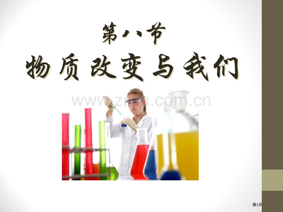 第八节物质改变与我们第第1页页我们知道:自然界物质会发生各种各我们知道:自然界物质会发生各种各样改变,样改变,你能说出你能说出生活中物质改变实生活中物质改变实例吗?例吗?我们已经知道,我们周围物质总是在我们已经知道,我们周围物质总是在发生各种各样改变,如:发生各种各样改变,如:太阳升降太阳升降、月亮圆缺月亮圆缺、细胞分裂、生长和分化细胞分裂、生长和分化,物质溶解性物质溶解性、下雨下雨、木柴燃烧木柴燃烧、植物植物光合作用光合作用、瀑布落下瀑布落下、电灯发光电灯发光、冰冰山消融山消融、水电解水电解 第第2页页下雨下雨瀑布落下瀑布落下植物光合作用植物光合作用这些改变又是什么改变?这些改变又是什么改变?物理改变物理改变化学改变化学改变木柴燃烧木柴燃烧第第3页页什么是化学改变?什么是物理改变?什么是化学改变?什么是物理改变?物理改变:物理改变:改改变变中中没没有有新新物物质质产产生生,只有只有形态形态、状态状态改变。改变。化学改变:化学改变:改变中会产生改变中会产生新物质新物质。第第4页页500以下以下10001300以上以上冰山消融冰山消融钢铁生锈钢铁生锈第第5页页窗玻璃上水滴窗玻璃上水滴燃烧引发爆炸燃烧引发爆炸 第第6页页1、二者根本区分:、二者根本区分:改变中有没有新物质生成改变中有没有新物质生成2、二者联络、二者联络:化学改变一定伴伴随物理改变化学改变一定伴伴随物理改变物理改变和化学改变联络和区分?物理改变和化学改变联络和区分?物理改变中不一定有化学改变物理改变中不一定有化学改变第第7页页物物质质变变化化特点:生成新物质特点:生成新物质物理改变物理改变化学改变化学改变 特点:特点:没有生成新物质没有生成新物质第第8页页空气液化空气液化铜器生绿锈铜器生绿锈 二氧化碳使澄清石灰水变浑浊二氧化碳使澄清石灰水变浑浊酒精挥发酒精挥发 火药爆炸火药爆炸 灯丝通电后发光放热灯丝通电后发光放热、判断以下改变是物理改变还化学改变、判断以下改变是物理改变还化学改变物理改变物理改变化学改变化学改变化学改变化学改变物理改变物理改变化学改变化学改变 物理改变物理改变第第9页页水泥水泥包含一系列物理、化学改变第第10页页烟花烟花猛烈化学改变第第11页页第第12页页物质性质物质性质物理性质物理性质化学性质化学性质颜色颜色气味气味软硬软硬晶体熔点晶体熔点液体沸点液体沸点物质溶解性物质溶解性酸碱性酸碱性可燃性可燃性下面八种性质分别属于下面八种性质分别属于化学性质还是物理性质?化学性质还是物理性质?颜色颜色气味气味软硬软硬晶体熔点晶体熔点液体沸点液体沸点物质溶解性物质溶解性酸碱性酸碱性可燃性可燃性第第13页页3 3、钢铁熔化、钢铁熔化温度温度改变、改变、状态状态发生改变发生改变4 4、冰山消融、冰山消融状态状态、形状形状发生改变发生改变5 5、铁丝形变、铁丝形变形状形状发生改变发生改变6 6、水电解、水电解物物质质性性质质发发生生了了改改变变,产产生生了了 新物质新物质,气体产生气体产生生生成成沉沉淀淀、颜颜色色改改变变、气气体体产产生生、温温度度改改变变、性性质质改改变变、发发光光发发烧烧、PHPH改改变变、状状态态改变等。改变等。物质改变证据物质改变证据第第14页页物质改变物质改变伴随现象伴随现象特点特点属于什么属于什么改变改变水结冰、水蒸发状态改变没有生成新物质物理改变物理改变易拉罐压扁形状改变弯折铁丝形状改变混合沙和豆子基本不变火柴蜡烛燃烧发光发烧发光发烧产生了新物质化学改变化学改变在米饭上滴碘酒改变颜色小苏打和白醋产生气体铁生锈颜色、性质改变硫酸铜轻易和铁钉硫酸铜轻易和铁钉颜色改变,沉淀产生第第15页页制作饮料制作饮料橙汁饮料柠檬汽水第第16页页火药创造黑火药创造于唐代,发展于宋末至明初。火药是我国古代四大创造之一,火药是我国古代四大创造之一,最早火药出自炼丹术之手。最早火药出自炼丹术之手。“伏火矾法伏火矾法”第第17页页