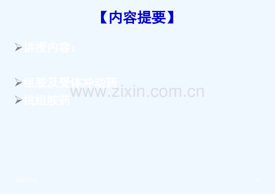 本组胺和抗组胺药2讲授内容:讲授内容:组胺及受体冲动药组胺及受体冲动药抗组胺药抗组胺药【内容提要内容提要】2021/1/122【学习要求学习要求】掌握掌握 组胺组胺H1H1和和H2H2受体阻断药的药理作用和临床应用。受体阻断药的药理作用和临床应用。理解理解 自体活性物质的生理效应。自体活性物质的生理效应。2021/1/123自体活性物质自体活性物质 由本身作用的靶组织形成,作用部位与分泌部位很近,由本身作用的靶组织形成,作用部位与分泌部位很近,不需由血循环运送到靶器官发挥作用。不需由血循环运送到靶器官发挥作用。故又称部分激素故又称部分激素local hormoneslocal hormones注:注:不是由内分泌腺产生。不是由内分泌腺产生。PGPG、5-HT5-HT、组胺、白、组胺、白三烯、血管活性肽类三烯、血管活性肽类P P物质,激肽类,物质,激肽类,血管紧张素,利尿钠血管紧张素,利尿钠肽,降钙素基因相关肽,降钙素基因相关肽等、肽等、NONO、腺苷等、腺苷等2021/1/124组胺组胺Histamine是最早发现的自身活性物质,广泛存在于人体各组织。是最早发现的自身活性物质,广泛存在于人体各组织。组胺受体有组胺受体有H H1 1、H H2 2、H H3 3三种。三种。第一节第一节 组胺及受体冲动药组胺及受体冲动药 2021/1/125贮存:贮存:组胺以无活性的结合型贮存于组织的肥大细胞和血液的嗜组胺以无活性的结合型贮存于组织的肥大细胞和血液的嗜碱性颗粒细胞当中。碱性颗粒细胞当中。释放:释放:当机体发生变态反响或受到物理或化学刺激时,就会引起当机体发生变态反响或受到物理或化学刺激时,就会引起这些细胞脱颗粒,使组胺由结合型变为游离型释放。这些细胞脱颗粒,使组胺由结合型变为游离型释放。组胺的组胺的贮贮存与存与释放释放 2021/1/126受体受体分布分布效应效应阻断剂阻断剂 H H1 1 支气管、胃肠支气管、胃肠 子宫等子宫等平滑肌平滑肌 皮肤血管皮肤血管 心房、房室结心房、房室结收缩收缩血管扩张血管扩张收缩增加、传导变慢收缩增加、传导变慢 苯海拉明苯海拉明 异丙嗪异丙嗪 氯苯那敏氯苯那敏 H H2 2 胃壁细胞胃壁细胞 血管血管 心室、窦房结心室、窦房结胃酸分泌胃酸分泌血管舒张血管舒张收缩加强、心率加快收缩加强、心率加快 西米替丁西米替丁 雷尼替丁雷尼替丁 H H3 3 脑组胺能神经末梢脑组胺能神经末梢抑制组胺释放抑制组胺释放组胺受体在体内的分布及其效应:组胺受体在体内的分布及其效应:2021/1/127【组胺的详细作用】【组胺的详细作用】皮内小剂量注射:皮内小剂量注射:出现三重(联)反应出现三重(联)反应 毛细血管扩张毛细血管扩张 红斑红斑 毛细血管透性毛细血管透性 丘疹丘疹 轴索反射致小动脉扩张轴索反射致小动脉扩张 红晕红晕麻风病患者常不完全,故用于辅助诊断麻风病麻风病患者常不完全,故用于辅助诊断麻风病心血管心血管:心脏:心脏:H H2 2受体受体传导传导、心率、心率、心肌收缩力、心肌收缩力血管:血管:H H1 1受体受体毛细血管透性毛细血管透性,出现局部水肿,出现局部水肿 H H1 1、H H2 2受体受体血管扩张,血管扩张,BpBp甚至休克甚至休克2021/1/1289麻风治疗首选?麻风治疗首选?氨苯砜为首选药氨苯砜为首选药2021/1/129促进腺体分泌:促进腺体分泌:H H2 2-R(+)-R(+)胃酸分泌胃酸分泌兴奋平滑肌兴奋平滑肌:对血管以外的平滑肌主要是:对血管以外的平滑肌主要是兴奋兴奋作用,但作用,但有种属差异、组织差异。有种属差异、组织差异。支气管平滑肌支气管平滑肌:健康人:常量无影响;健康人:常量无影响;哮喘者:敏感,收缩,少量即有呼吸困难;哮喘者:敏感,收缩,少量即有呼吸困难;豚鼠:最敏感。豚鼠:最敏感。2021/1/1210胃肠道平滑肌胃肠道平滑肌:收缩。:收缩。子宫平滑肌:子宫平滑肌:大鼠松弛;豚鼠收缩;人无影响。大鼠松弛;豚鼠收缩;人无影响。神经系统神经系统:瘙痒、疼痛,中枢兴奋。:瘙痒、疼痛,中枢兴奋。2021/1/1211晨起空腹皮下注射:晨起空腹皮下注射:鉴别胃癌和恶性贫血患者是否发生真性胃酸缺乏。鉴别胃癌和恶性贫血患者是否发生真性胃酸缺乏。皮内小剂量注射:辅助诊断麻风病(三联反应)皮内小剂量注射:辅助诊断麻风病(三联反应)毛细血管扩张毛细血管扩张红斑红斑毛细血管透性毛细血管透性丘疹丘疹轴索反射轴索反射红晕红晕麻风病患者常不完全麻风病患者常不完全【不良反响】【不良反响】注:支气管哮喘者禁用注:支气管哮喘者禁用【组胺的临床应用组胺的临床应用】颜面潮红、头痛、直立性低血压。颜面潮红、头痛、直立性低血压。(无无真真)2021/1/1212培他司汀培他司汀 (betahistine,倍他定倍他定)H1-RH1-R冲动药冲动药作用作用:扩张血管:促进脑干和迷路血液循环,扩张血管:促进脑干和迷路血液循环,纠正内耳血管痉挛,减轻迷路积水;纠正内耳血管痉挛,减轻迷路积水;抗血小板聚集,抗血栓形成抗血小板聚集,抗血栓形成用处:用处:内耳眩晕病、耳鸣;内耳眩晕病、耳鸣;血管性头痛及脑动脉硬化;血管性头痛及脑动脉硬化;急性缺血性脑血管疾病。急性缺血性脑血管疾病。2021/1/1213第二节第二节 抗组胺药抗组胺药一一H1H1受体阻断药抗过敏药受体阻断药抗过敏药第一代第一代:苯海拉明苯海拉明(diphenhydramine(diphenhydramine,苯那君,苯那君异丙嗪异丙嗪promethazinepromethazine,非那根,非那根曲吡那敏曲吡那敏pyriben