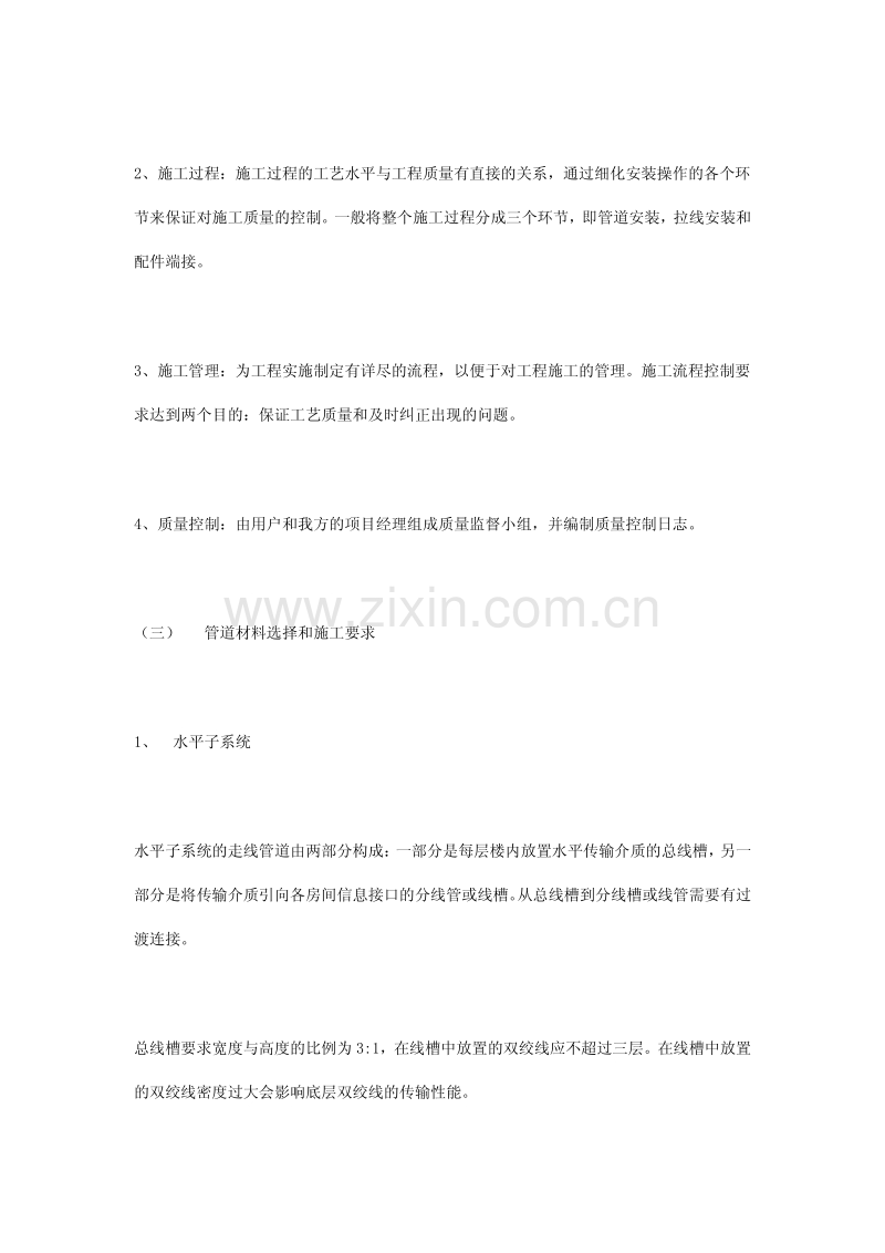 IBDN 综合布线施工解决方案 IBDN 综合布线施工解决方案 (一) 施工方案设计的依据 《ISO/IEC11801》商业建筑物综合布线系统国际标准 《EIA/TIA568A》商业建筑物综合布线系统美国标准 《EIA/TIA569》通信布线管线和空间设计施工标准 《建筑与建筑群综合布线工程设计规范》 《建筑与建筑群综合布线工程施工及验收规范》 ISO/IEC11801 和 EIA/TIA-568A 是开放式布线系统设计依据的两个重要标准。 它对开放式布 线系统的产品性能参数,系统设计方法和端接配件安装都作了明确规定。EIA/TIA569 是为 了配合以上标准对开放式布线系统施工制定的标准。《建筑与建筑群综合布线工程设计规 范》、《建筑与建筑群综合布线工程施工及验收规范》是我国工程建设标准化委员会于 199 7 年 5 月颁布的适合我国国情的新标准。 (二) 施工设计要求 在开放式布线系统施工设计阶段就考虑在工程施工的全过程如何对工程质量做出有效的管 理和监控的问题。 为了保证工程质量, 开放式布线系统施工设计应解决好以下几方面的问题: 1、施工设计:对建筑物结构做出详细勘测之后,同用户一起规划出管线施工图。施工设计 的合理性对工程质量是至关重要的。 2、施工过程:施工过程的工艺水平与工程质量有直接的关系,通过细化安装操作的各个环 节来保证对施工质量的控制。一般将整个施工过程分成三个环节,即管道安装,拉线安装和 配件端接。 3、施工管理:为工程实施制定有详尽的流程,以便于对工程施工的管理。施工流程控制要 求达到两个目的:保证工艺质量和及时纠正出现的问题。 4、质量控制:由用户和我方的项目经理组成质量监督小组,并编制质量控制日志。 (三) 管道材料选择和施工要求 1、 水平子系统 水平子系统的走线管道由两部分构成: 一部分是每层楼内放置水平传输介质的总线槽, 另一 部分是将传输介质引向各房间信息接口的分线管或线槽。 从总线槽到分线槽或线管需要有过 渡连接。 总线槽要求宽度与高度的比例为 3:1,在线槽中放置的双绞线应不超过三层。在线槽中放置 的双绞线密度过大会影响底层双绞线的传输性能。 水平线槽一般有多处转弯,在转弯处应留有足够大的空间以保证双绞线有充分的弯曲半径。 根据 EIA/TIA569 标准,超五类 4 对非屏蔽双绞线的弯曲半径应不小于线径的 8 倍。最新的 标准认为,弯曲半径大于线径的 4 倍已可以满足传输要求了。但有一点是重要的,即保持足 够大的弯曲半径可以保证系统的传输性能。 在水平线槽的转弯处, 应有垫衬以减小拉线时的摩擦力。 水平子系统线槽或线管应采用镀锌 铁槽或铁管。双绞线和光纤对安装有不同的要求,双绞线垂直放置于竖井之内,由于自身的 重量牵拉, 日久之后会使双绞线的绞合发生一定程度的改变, 这种改变对传输语音的三类线 来说影响不是太大,但对需要传输高速数据的超五类线,这个问题是不能被忽略的,因此设 计垂直竖井内的线槽时应仔细考虑双绞线的固定。 双绞线的固定时的力的大小是应该受到重 视的一种技巧,如果扎线太紧可能会降低 NEXT 值,从而影响线缆的传输性能。 缆线的敷设和保护方式检验 缆线一般应按下列要求敷设: 缆线的型式、规格应与设计规定相符。 缆线的布放应自然平直,不得产生扭绞、打圈接头等现象,不应受外力的挤压和损伤。 缆线两端应贴有标签,应标明编号,标签书写应清晰,端正和正确。标签应选用不易损坏的 材料。 缆线终接后,应有余量。交接间、设备间对绞电缆预留长度宜为 0.5~1.0m,工作区为 10~3 0mm;光缆布放宜盘留,预留长度宜为 3~5m,有特殊要求的应按设计要求预留长度。 缆线的弯曲半径应符合下列规定: (1)非屏蔽 4 对对绞线电缆的弯曲半径应至少为电缆外径的 4 倍; (2)屏蔽 4 对对绞线电缆的弯曲半径应至少为电缆外径的 6~10 倍; (3)主干对绞电缆的弯曲半径应至少为电缆外径的 10 倍; (4)光缆的弯曲半径应至少为光缆外径的 15 倍。 电源线、综合布线系统缆线应分隔布放,缆线间的最小净距应符合设计要求。 在暗管或线槽中缆线敷设完毕后,宜在信道两端出口处用填充材料进行封堵。 预埋线槽和暗管敷设缆线应符合下列规定: 敷设线槽的两端宜用标志表示出编号和长度等内容。 敷设暗管宜采用钢管或阻燃硬质 PVC 管。 布放多层屏蔽电缆、 扁平缆线和大对数主干光缆时, 直线管道的管径利用率为 50%~60%,弯管道应为 40%~50%。暗管布放 4 对对绞电缆或 4 芯以 下光缆时,管道的截面利用率应为 25%~30%。预埋线槽宜采用金属线槽,线槽的截面利用率 不应超过 50%。 设置电缆桥架和线槽敷设缆线应符合下列规定: 电缆线槽、桥架宜高出地面 2.2m 以上。线槽和桥架顶部距楼板不宜小于 30mm;在过梁或其 它障碍物处,不宜小于 50mm。 槽内缆线布放应顺直,尽量不交叉,在缆线进出线槽部位、转弯处应绑扎固定,其水平部分 缆线可以不绑扎。垂直线槽布放缆线应每间隔 1.5m 固定在缆线支架上。 电缆桥架内缆线垂直敷设时,在缆线的上端和每间隔 1.5m 处应固定在桥架的支架上;水平 敷设时,在缆线的首、尾、转弯及每间隔 5~10m 处进行固定。 在水平、垂直桥架和垂直线槽中敷设缆线时,应对缆线进行绑扎。对绞电缆、光缆及其它信 号电缆应根据缆线的类别、数量、缆径、缆线芯数分束绑扎。绑扎间距不宜大于 1.5m,间 距应均匀,松紧适度。 楼内光