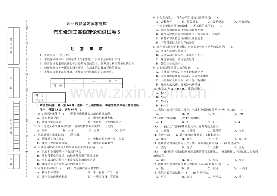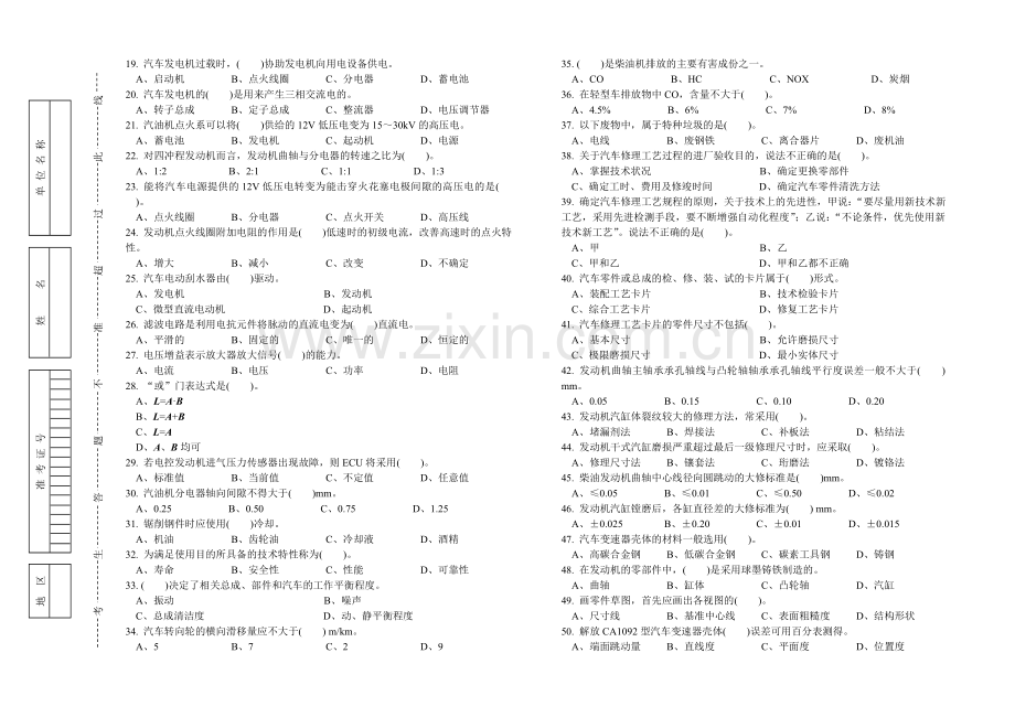 2、本试卷依据2001年颁布的《汽车修理工 国家职业标准》命制。