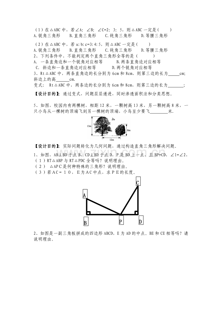 2、综合运用直角三角形的知识解决实际问题,是本节课学习的重点和难点。因此从题目的安排上由浅入深、由易到难,层层递进。基础部分注重学生对性质,判断的掌握,授予学生数学思想和方法(面积法,分类思想,构造法,全等转换,方程思想),起到巩固已有知识,提高解题能力,掌握解题技巧的目的,能力题力求教法新型,创新,激发学生的求知欲望,同一题不同问题,同一问题不同条件,同一图形不同变化,让学生在变化中找不同,在相同中寻不同,培养思维能力和逻辑能力,并体验通过解决问题带来的成就感。