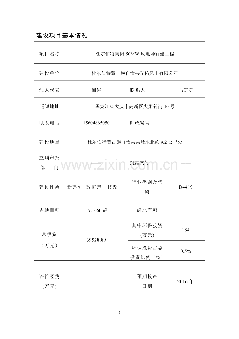 (1)项目名称:杜尔伯特南阳50MW风电 场新建工程