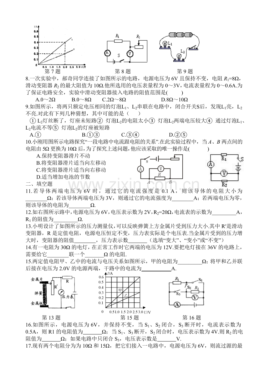 8.一次实验中,郝奇同学连接了如图所示的电路,电源电压为6V且保持不变,电阻R1=8Ω,滑动变阻器R2的最大阻值为10Ω.他所选用的电压表量程为0~3V,电流表量程为0~0.6A.为了保证电路安全,实验中滑动变阻器接入电路的阻值范围是( )