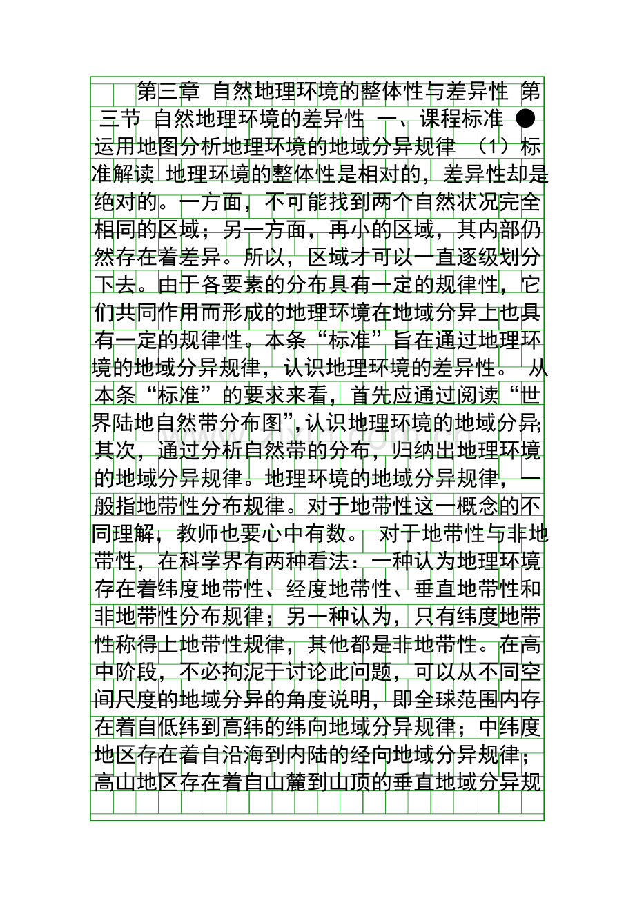 第三章 自然地理环境的整体性与差异性 第三节 自然地理环境的差异性 一、课程标准 ● 运用地图分析地理环境的地域分异规律 (1)标准解读 地理环境的整体性是相对的,差异性却是绝对的。一方面,不可能找到两个自然状况完全相同的区域;另一方面,再小的区域,其内部仍然存在着差异。所以,区域才可以一直逐级划分下去。由于各要素的分布具有一定的规律性,它们共同作用而形成的地理环境在地域分异上也具有一定的规律性。本条“标准”旨在通过地理环境的地域分异规律,认识地理环境的差异性。 从本条“标准”的要求来看,首先应通过阅读“世界陆地自然带分布图”,认识地理环境的地域分异;其次,通过分析自然带的分布,归纳出地理环境的地域分异规律。地理环境的地域分异规律,一般指地带性分布规律。对于地带性这一概念的不同理解,教师也要心中有数。 对于地带性与非地带性,在科学界有两种看法:一种认为地理环境存在着纬度地带性、经度地带性、垂直地带性和非地带性分布规律;另一种认为,只有纬度地带性称得上地带性规律,其他都是非地带性。在高中阶段,不必拘泥于讨论此问题,可以从不同空间尺度的地域分异的角度说明,即全球范围内存在着自低纬到高纬的纬向地域分异规律;中纬度地区存在着自沿海到内陆的经向地域分异规律;高山地区存在着自山麓到山顶的垂直地域分异规律;因海陆分布、地形、河湖等引起的属于非地带性地域分异规律。 自然带的界线是对地理环境客观现实的反映,同时又是人为主观划分的,所以需要说明,各自然带之间的界线,在现实中是不存在的。现实中总是由一种自然带的典型景观逐渐过渡到另一种自然带的典型景观。 (2)教学重点 l 地理环境的地域分异规律 (3)教学目标 l 能够举例说明自然地理环境的差异性的表现。 l 能够结合世界自然带的分布情况,归纳、分析、比较地理环境的地域分异规律,并能分析形成的原因。 l 能举例说明认识自然地理环境差异性和掌握自然地理环境的地域分异规律的实践意义。 (4)教学方法 l 案例分析法、读图教学法、组织讨论法 二、知识结构(见第二章第四节目标检测后)