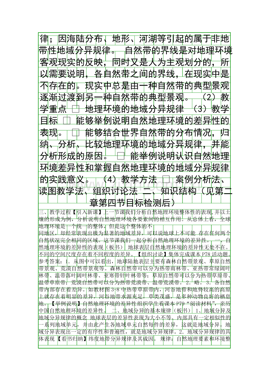 同地区,却经常表现出极为显著的地域差异,可以说地球上不可能 存在任何两个自然状况完全相同的区域。这节课我们一起分析自然地理环境的差异性。 一、自然地理环境的差异性的表现(板书) 地球表层自然地理环境的差异性无处不在。不同的空间尺度存 在着不同程度的差异。 【组织讨论】集体完成课本P78活动题。 参考答案:1.从图中可以看出,地球陆地表层主要有森林自然带景观、草原自然带景观、荒漠自然带景观等。森林自然带可以分为热带雨林带、亚热带常绿阔叶林带、温带落叶阔叶林带、亚寒带针叶林带等;草原自然带可以分为热带草原带、温带草原带;荒漠自然带可以分为热带荒漠带、温带荒漠带。 2.略。 3.各自然带内部存在着差异。如教材图3-8中热带草原带内,河谷地带和地势较高的高原上就存在着明显的差异,河谷地带水源充足,草类茂盛,是多种动物良好的栖息地。 【举例说明】自然地理环境的差异性 组织学生看课本P79“阅读材料”,亲历中国自然地理环境的差异性。 二、地域分异的基本规律(板书) 1、地域分异及地域分异规律的概念 地球表层的差异性表现为大小不等、内部具有一定相似性的一系列地域单元,并由此产生各地域单元自然每件的差异,这就是地域分异。地域分异表现出一定的有序性和普遍性,就是地域分异规律。 2.地域分异规律的具体表现 【看书归纳】纬度地带分异规律及其成因。 规律:自然地理要素和环境整体特征大体上沿纬线延伸、随纬度变化,呈纬向带状分布的差异。 成因:太阳辐射能带来的热量在地球表面从低纬度向高纬度逐渐减少,即以热量为基础。 【举例分析】集体完成课本P79活动题,分析纬度地带分异规律。 参考答案:1.从海南岛到漠河的景观变化,反映的是纬度地带性分异规律,因为各地景观大体上沿纬线沿伸、随纬度变化。 2.影响纬度地带性分异的基本因素是太阳辐射能带来的热量在地球表面从低纬度向高纬度逐渐减少。 【看书归纳】干湿度地带分异规律及其成因。