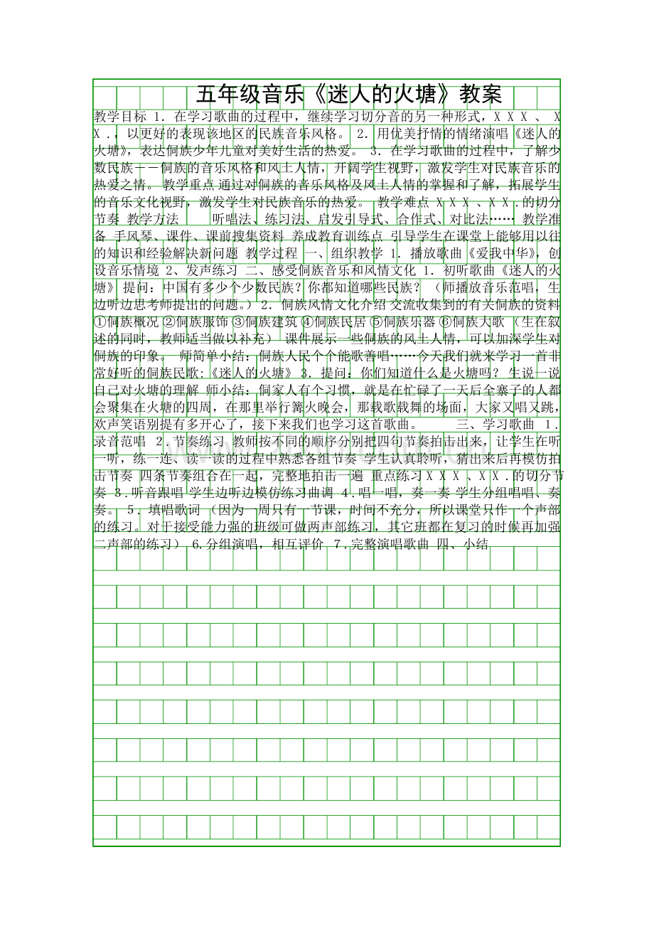 教学目标 1.在学习歌曲的过程中,继续学习切分音的另一种形式,X X X 、 X X .,以更好的表现该地区的民族音乐风格。 2.用优美抒情的情绪演唱《迷人的火塘》,表达侗族少年儿童对美好生活的热爱。 3.在学习歌曲的过程中,了解少数民族――侗族的音乐风格和风土人情,开阔学生视野,激发学生对民族音乐的热爱之情。 教学重点 通过对侗族的音乐风格及风土人情的掌握和了解,拓展学生的音乐文化视野,激发学生对民族音乐的热爱。 教学难点 X X X 、X X .的切分节奏 教学方法 听唱法、练习法、启发引导式、合作式、对比法…… 教学准备 手风琴、课件、课前搜集资料 养成教育训练点 引导学生在课堂上能够用以往的知识和经验解决新问题 教学过程 一、组织教学 1.播放歌曲《爱我中华》,创设音乐情境 2、发声练习 二、感受侗族音乐和风情文化 1.初听歌曲《迷人的火塘》 提问:中国有多少个少数民族?你都知道哪些民族? (师播放音乐范唱,生边听边思考师提出的问题。) 2.侗族风情文化介绍 交流收集到的有关侗族的资料 ①侗族概况 ②侗族服饰 ③侗族建筑 ④侗族民居 ⑤侗族乐器 ⑥侗族大歌 (生在叙述的同时,教师适当做以补充) 课件展示一些侗族的风土人情,可以加深学生对侗族的印象。 师简单小结:侗族人民个个能歌善唱……今天我们就来学习一首非常好听的侗族民歌:《迷人的火塘》 3.提问:你们知道什么是火塘吗? 生说一说自己对火塘的理解 师小结:侗家人有个习惯,就是在忙碌了一天后全寨子的人都会聚集在火塘的四周,在那里举行篝火晚会,那载歌载舞的场面,大家又唱又跳,欢声笑语别提有多开心了,接下来我们也学习这首歌曲。 三、学习歌曲 1.录音范唱 2.节奏练习 教师按不同的顺序分别把四句节奏拍击出来,让学生在听一听,练一连、读一读的过程中熟悉各组节奏 学生认真聆听,猜出来后再模仿拍击节奏 四条节奏组合在一起,完整地拍击一遍 重点练习X X X 、X X .的切分节奏 3.听音跟唱 学生边听边模仿练习曲调 4.唱一唱,奏一奏 学生分组唱唱、奏奏。 5. 填唱歌词 (因为一周只有一节课,时间不充分,所以课堂只作一个声部的练习。对于接受能力强的班级可做两声部练习,其它班都在复习的时候再加强二声部的练习) 6.分组演唱,相互评价 7.完整演唱歌曲 四、小结