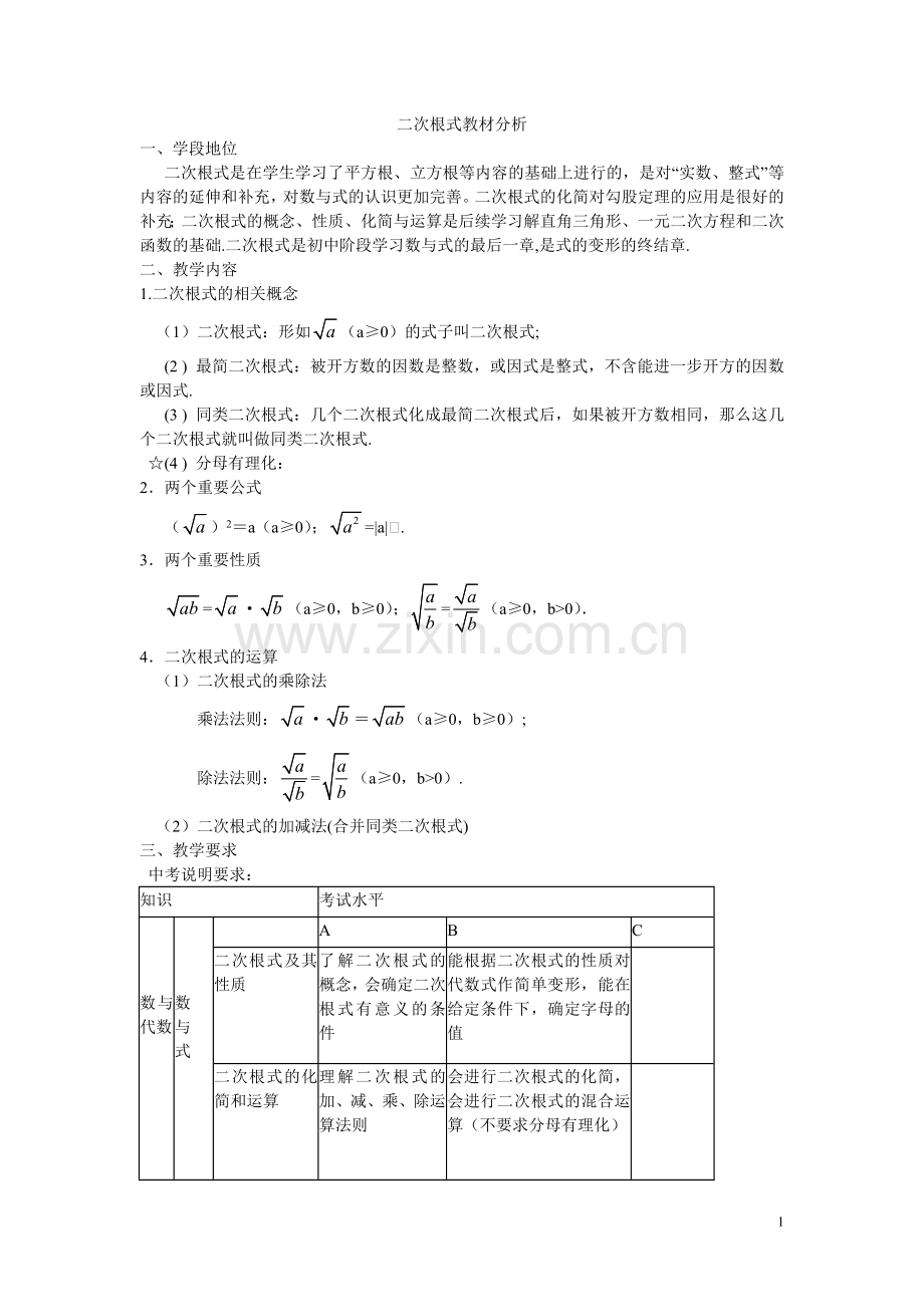 二次根式是在学生学习了平方根、立方根等内容的基础上进行的,是对“实数、整式”等内容的延伸和补充,对数与式的认识更加完善。二次根式的化简对勾股定理的应用是很好的补充;二次根式的概念、性质、化简与运算是后续学习解直角三角形、一元二次方程和二次函数的基础.二次根式是初中阶段学习数与式的最后一章,是式的变形的终结章.