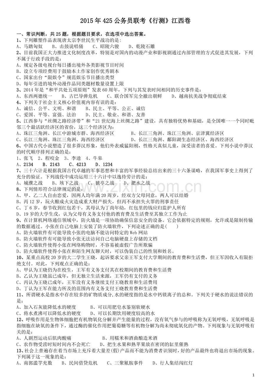 120152015 年年 425425 公务员联考行测江西卷公务员联考行测江西卷一、常识判断,共一、常识判断,共 2525 题,根据题目要求,在选项中选出答案。题,根据题目要求,在选项中选出答案。1 1、下列雕塑作品表现唐太宗李世民生平战功的是:A、马踏匈奴B、击鼓说唱俑C、昭陵六骏D、乾陵石雕2 2、目前我国正大力推进文化制度改革,特别是对国内的动漫产业和影视剧通过内部管理的方式促进其发展,下列不属于行政手段的是:A、规定各级电视台每日播出境外各类影视节目时间B、设立专项经费用于鼓励本土作家创作优秀剧本C、国家出台“限娱令”规范娱乐节目播出类型D、每年引进的境外动漫作品同类题材数量设置上限3 3、2014 年是“和平共处五项原则”发表 60 周年,下列与其发表时间相同的历史事件是:A、东西两德统一B、古巴导弹危机C、联合国军完全撤出朝鲜D、越南抗美战争彻底结束4 4、下列关于社会主义核心价值观内容有误的是:A、诚信、公平、文明、和谐B、民主、平等、公正、诚信C、爱国、平等、富强、法治D、民主、敬业、和谐、友善5 5、江西参与“丝绸之路经济带”和“21 世纪海上丝绸之路”建设,具有独特优势和基础,是全国唯一一个同时毗邻三个最活跃经济区的省份,这三个经济区为:A、珠江三角洲、长江中游城市群、海西经济区B、长江三角洲、珠江三角洲、京津冀经济区C、长江三角洲、珠江三角洲、海西经济区D、长江三角洲、鄱阳湖生态经济区、海西经济区6 6、中国古代小说塑造了很多莽汉形象,他们外表威猛阳刚,性格天真似儿童,深受读者的喜爱。下列小说中莽汉的时代顺序排列正确的是:1、张飞2、程咬金3、李逵4、牛皋A、21342134B B、21432143C C、42134213D D、123412347 7、三十六计是根据我国古代卓越的军事思想和丰富的军事经验总结出来的三十六条谋略,在我国军事史上得到了充分的验证。下列战役中成功运用三十六计中以逸待劳计的是:A、城濮之战B、垓下之战C、猇亭之战D、淝水之战8 8、下列情形符合法律规定的是:A、甲、乙二人自由恋爱,因两人均年满 20 周岁,经双方父母同意,两人可以结婚B、丙 12 岁,玩火酿成火灾造成重大财产损失,但丙不承担失火罪的刑事责任C、丁 6 岁,春节收到红包若干,其母认为丁尚年幼,红包里的钱应归监护人所有D、19 岁的大学生戊,认为父母有义务支付他的教育费及生活费至其独立工作为止9 9、在计算机网络通信领域中,防火墙是一项协助确保信息安全的设备。它会依据特定的规则,允许或是限制传输的数据通过。小张在自己电脑上安装了防火墙软件,下列论述正确的是()A、防火墙软件有可能导致小张的电脑不能访问特定的 Web 网站B、防火墙软件有可能导致小张无法访问自己电脑硬盘上存储的文档C、防火墙软件使得小张在网络购物时,不容易被虚假广告所欺骗D、防火墙软件使得小张在和陌生网友聊天时,可以伪装自己的性别和姓名。1010、某重点高校 20 岁的大二学生王晓,起诉要求父亲王军支付大学期间的教育费和生活费,但王军因收入有限拒绝支付。对此,下列观点正确的是:A、甲认为王晓仍为在校生,王军有义务支付其在校期间的教育费和生活费B、乙认为王晓虽已成年,但无独立生活来源,王军仍有支付的义务C、丙认为王晓已成年,王军没有义务继续支付王晓教育和生活费用D、丁认为王军在能力所及的范围内有义务支付王晓教育费和生活费1111、所谓硬水是指水中存在较多的矿物质成分,水的硬度指的是水中钙镁离子的总和。下列关于硬水的说法错误的是:A、加入石灰能降低水的硬度B、可以用肥皂水鉴别软硬水C、将水煮沸可以降低水的硬度D、可以长期饮用硬度较高的水1212、呼吸作用是生物体细胞把有机物氧化分解并产生能量的过程,没有氧气参与的呼吸称为无氧呼吸,无氧呼吸是指细胞在缺氧的条件下,通过酶的催化作用把葡萄糖等有机物分解为尚未彻底氧化的产物。下列现象与无氧呼吸有关的是:A、人剧烈运动后肌肉酸痛B、用糯米和酒曲酿造米酒C、农作物受涝时短时间内不会死亡D、把生水果和熟苹果放在密闭的缸里催熟1313、社会上普遍存在着当市场上充斥着大量差(假)产品而不能为消费者识别时,好的产品最终也将退出市场的现象。下列属于这一现象的是:A、南郭滥竽充数B、民间借贷危机C、三聚氰胺事件D、行人集结闯红灯21414、地球自转一圈的时间是一天,地球半径为 6371 千米。毛泽东诗词“坐地日行八万里”是有科学依据的,人可以随着地球的自转运动,那么与诗句最吻合的可能是哪个国家的人:A、阿富汗B、南非C、新加坡D、挪威1515、古人记月除常用的序数法外,还以物候的特点来命名,或以孟、仲、季来命名各季节的三个月。那么,下列对应关系正确的是:A、孟春桃月B、仲夏荷月C、仲秋桂月D、季冬菊月1616、现代中医借助西医的物理检验手段,提高传统的“望-闻-问-切-处”的诊断准确性。这样的优化属于:A、工期优化B、技术优化C、成本优化D、流程优化1717、下列不属于心理学效应的是:A、晕轮效应B、马太效应C、破窗效应D、配位效应1818、通过云计算技术可以实现共享软硬件资源和信息。下列直接使用到云计算技术的是:A、将 ADSL 升级为光纤线路B、设计并制作 Web 网站页面C、向 ISP 申请注册网站域名D、使用 Google App Engine 服务,部署个人网站1919、下列诗句背景与