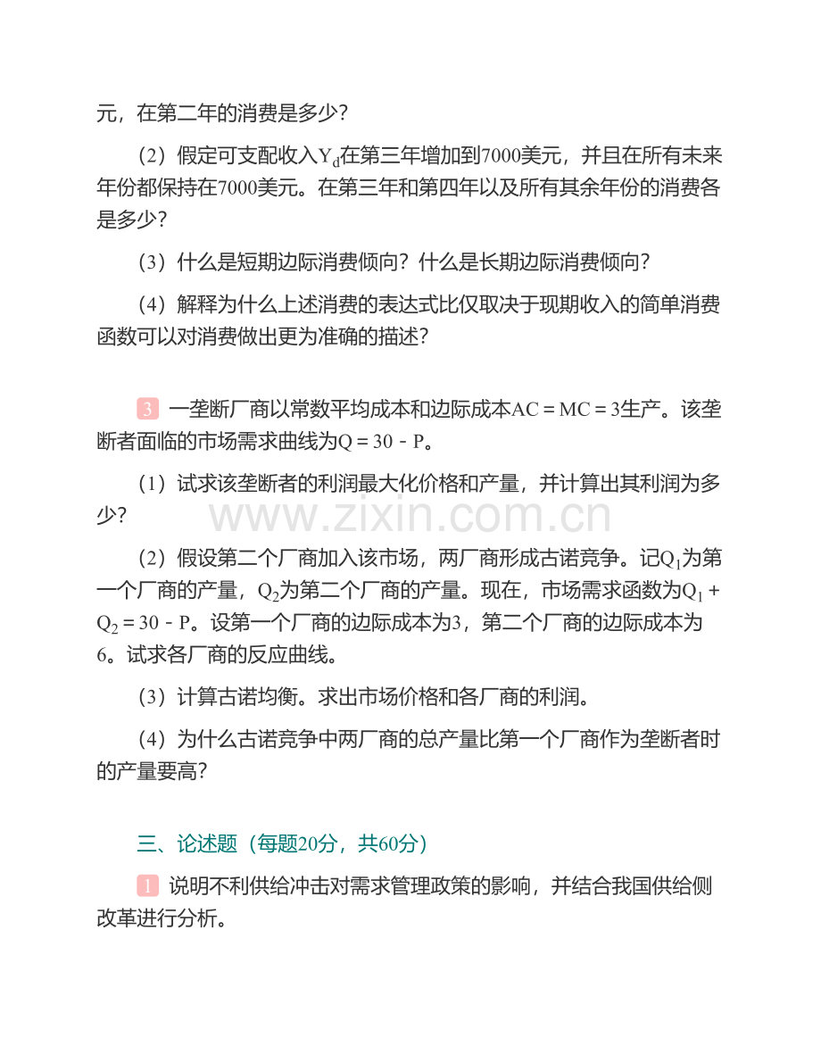目录复旦大学856经济学综合基础考前冲刺最后三套卷(一)复旦大学856经济学综合基础考前冲刺最后三套卷及详解(一)复旦大学856经济学综合基础考前冲刺最后三套卷(二)复旦大学856经济学综合基础考前冲刺最后三套卷及详解(二)复旦大学856经济学综合基础考前冲刺最后三套卷(三)复旦大学856经济学综合基础考前冲刺最后三套卷及详解(三)复旦大学856经济学综合基础考前冲刺最后三套卷(一)一、简答题(每题15分,共45分)1在新古典增长模型中,储蓄率的变动对经济有哪些影响?2什么是相对剩余价值与超额剩余价值?两者的区别是什么?3什么是战略性贸易政策?你认为它的实施能实现预期的目的与效果吗?二、计算题(每题15分,共45分)1假定经济满足YCIG,消费C8000.63Y,投资I750020000r,货币需求L0.1625Y10000r,名义货币供给量6000亿,价格水平为1,问当政府支出从7500增加到8500亿时,政府支出的挤出效应有多大?2假定我们有下述形式的消费函数,即:C2000.9Yp。式中,Yp是持久收入。假定消费者按照本年和上一年的可支配收入的简单平均来估算他的持久收入,即:Yp0.7Yd0.3Yd1。式中,Yd是当年可支配收入。(1)假定可支配收入在第一年是6000美元,在第二年也是6000美元,在第二年的消费是多少?(2)假定可支配收入Yd在第三年增加到7000美元,并且在所有未来年份都保持在7000美元。在第三年和第四年以及所有其余年份的消费各是多少?(3)什么是短期边际消费倾向?什么是长期边际消费倾向?(4)解释为什么上述消费的表达式比仅取决于现期收入的简单消费函数可以对消费做出更为准确的描述?3一垄断厂商以常数平均成本和边际成本ACMC3生产。该垄断者面临的市场需求曲线为Q30P。(1)试求该垄断者的利润最大化价格和产量,并计算出其利润为多少?(2)假设第二个厂商加入该市场,两厂商形成古诺竞争。记Q1为第一个厂商的产量,Q2为第二个厂商的产量。现在,市场需求函数为Q1Q230P。设第一个厂商的边际成本为3,第二个厂商的边际成本为6。试求各厂商的反应曲线。(3)计算古诺均衡。求出市场价格和各厂商的利润。(4)为什么古诺竞争中两厂商的总产量比第一个厂商作为垄断者时的产量要高?三、论述题(每题20分,共60分)1说明不利供给冲击对需求管理政策的影响,并结合我国供给侧改革进行分析。2“资本主义的生产过程,就是剩余价值的生产过程”。请用马克思的剩余价值理论进行分析。3国外对我国产品频繁进行反倾销和反补贴诉讼,请分析这类贸易摩擦产生的主要原因,并分析我国政府和企业在WTO规则下的应对策略。复旦大学856经济学综合基础考前冲刺最后三套卷及详解(一)一、简答题(每题15分,共45分)1在新古典增长模型中,储蓄率的变动对经济有哪些影响?答:在新古典增长模型中,储蓄率上升,会导致人均资本的上升,而人均收入是人均资本的增函数,因而储蓄率上升会增加人均产量,直到经济达到新的均衡为止。储蓄率下降的结果则反之。另一方面,稳态意味着:Y/YN/NK/Kn,所以,储蓄率的变动不能影响到稳态的增长率,从这一点上说,储蓄率的变动只有水平效应,没有增长效应。在图1中,经济最初位于C点的稳态均衡。现在假定人们想增加储蓄,这使储蓄曲线上移至sf(k)的位置,这时新的稳态为C。比较C点和C点,可知储蓄率的增加提高了稳态的人均资本和人均产量。图1储蓄率增加的影响新古典增长理论在这里得到的结论是储蓄率的增加不能影响到稳态增长率(因为这一增长率是独立于储蓄率的),但确实能提高收入的稳态水平。2什么是相对剩余价值与超额剩余价值?两者的区别是什么?答:(1)相对剩余价值与超额剩余价值的定义相对剩余价值是指在工作日长度不变的条件下,资本家通过缩短必要劳动时间、相应延长剩余劳动时间而产生的剩余价值。超额剩余价值是指企业由于提高劳动生产率而使商品个别价值低于社会价值的差额。超额剩余价值的源泉也是工人的剩余劳动。它的产生不是由于商品的价格高于价值,而是由于工人在同样的劳动时间中创造了更多的价值。个别或少数资本家获得超额剩余价值只是一种暂时的现象。(2)两者的区别 在现实的经济运行过程中,劳动生产率的提高总是从单个企业开始的。单个企业提高劳动生产率不能产生相对剩余价值,只能产生超额剩余价值。因为商品价值决定于生产商品的社会必要劳动时间,而不是决定于个别劳动时间,所以,单个企业劳动生产率的提高不能使生活资料价值降低,不能使社会必要劳动时间缩短,从而不能产生相对剩余价值。为了追求超额剩余价值,资本家之间进行激烈的竞争。少数企业不可能长期垄断先进生产条件,其他企业也会竞相采用新技术。当先进技术得到普及后,部门的平均劳动生产率将会提高,此时生产商品的社会必要劳动时间降低,商品价值相应下降。原来的先进生产条件转化为一般的生产条件,社会价值和个别价值的差额将不复存在,从而超额剩余价值也就消失了。超额剩余价值在个别资本家那里消失,整个资本家阶级却普遍获得了相对剩余价值。由此可知,超额剩余价值是由单个或个别资本家生产出来的,相对剩余价值是当整个部门的劳动生产率提高所有的资本家所获得的剩余价值。3什么是战略性贸易政策?你认为它的实施能实现预期的目的与效果吗?答:(1)战略性贸易政策的基本内容战略性贸易政策的观点是由新贸易理论者提出的。新