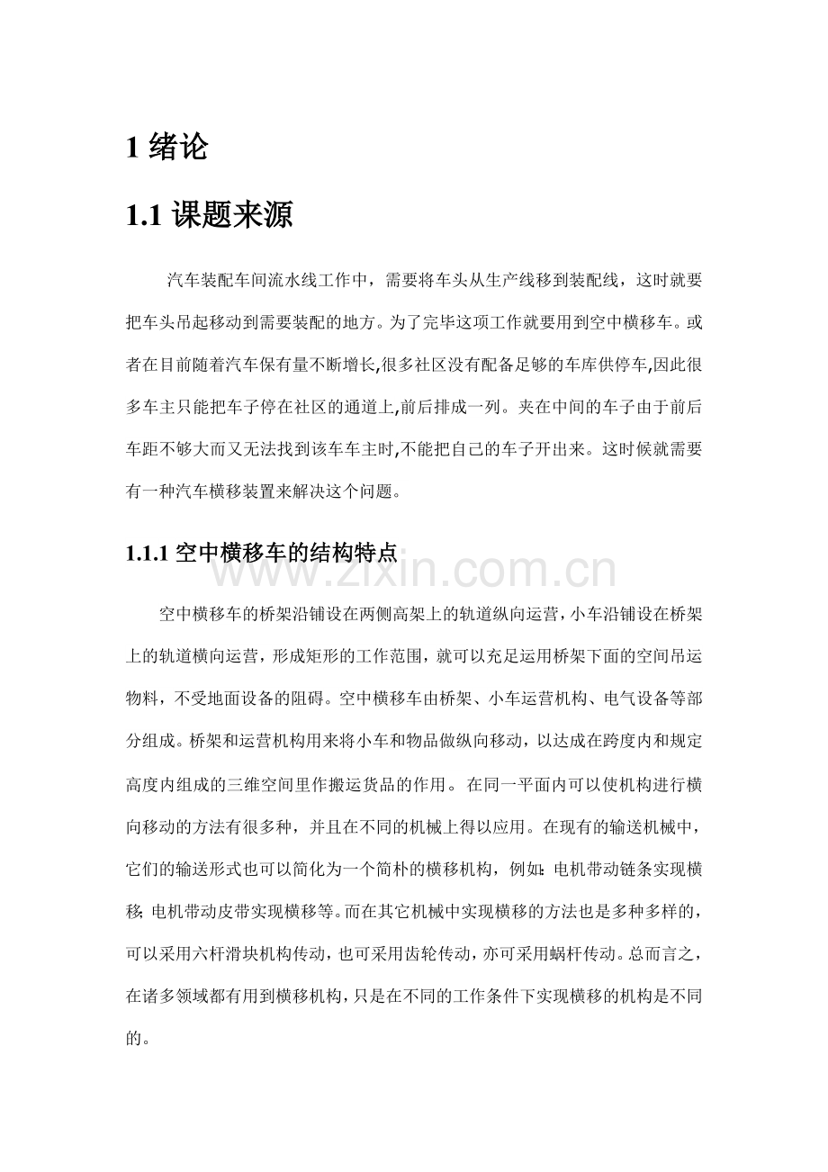 汽车装配车间流水线工作中,需要将车头从生产线移到装配线,这时就要把车头吊起移动到需要装配的地方。为了完毕这项工作就要用到空中横移车。或者在目前随着汽车保有量不断增长,很多社区没有配备足够的车库供停车,因此很多车主只能把车子停在社区的通道上,前后排成一列。夹在中间的车子由于前后车距不够大而又无法找到该车车主时,不能把自己的车子开出来。这时候就需要有一种汽车横移装置来解决这个问题。