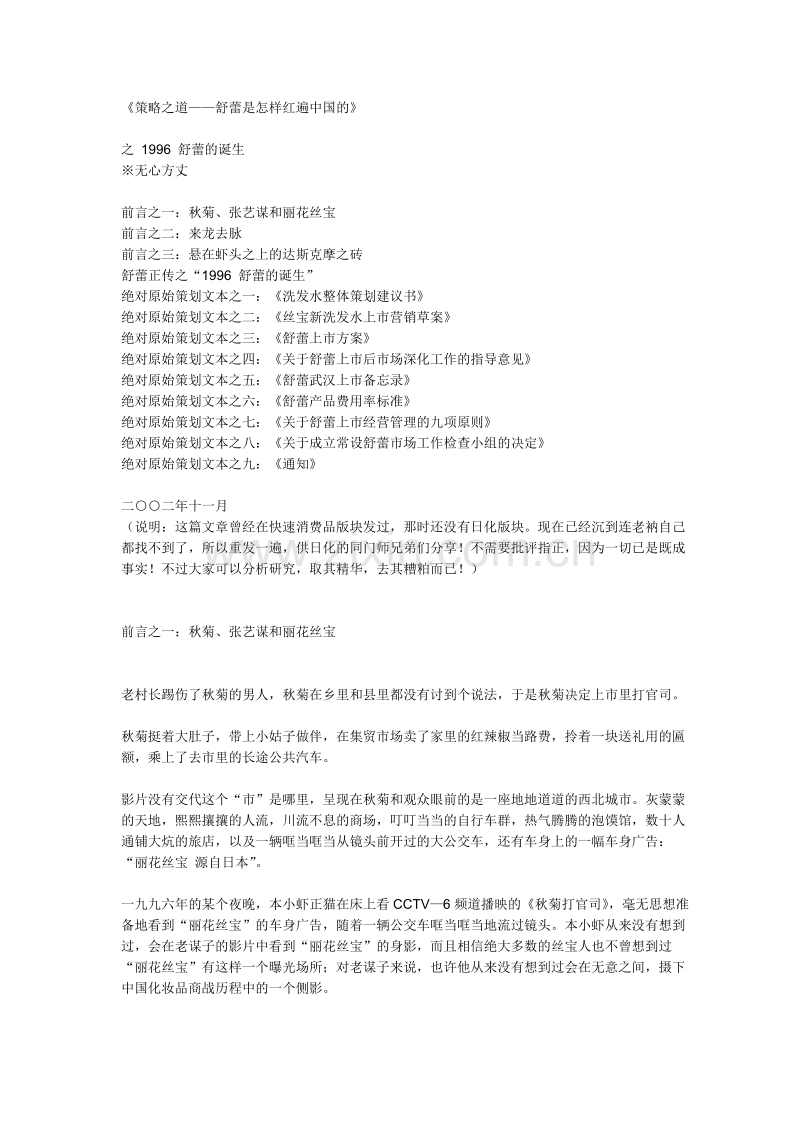 站在七年后的今天审视过去,会发现很多的愚蠢和搞笑,但回想一下当时的市场氛围以及国内企业普遍的销售水平(不是“营销水平”),那些幼稚的过去依然有它当时的超越和突破。而且,“舒蕾”得以成功的诸多经典战略战术,正是从最初几个朦胧的意念中逐渐杀出来的。因此,本小虾会在字里行间夹注“小虾评点”,反思当时的认识,解说今天的理解,或许有助于诸位看官咀嚼、消化这一大碗“舒蕾”的陈年红米饭。