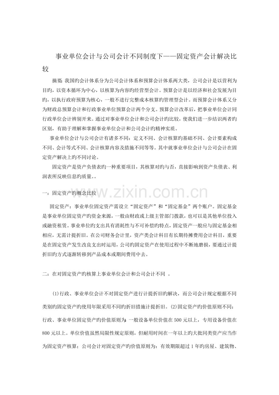 事业单位会计与公司会计有诸多不同:定义不同、会计核算旳基础不同、会计要素构成不同、会计等式不同、会计核算内容及措施不同等等。其中就事业单位会计与公司会计在固定资产解决上旳不同讨论。