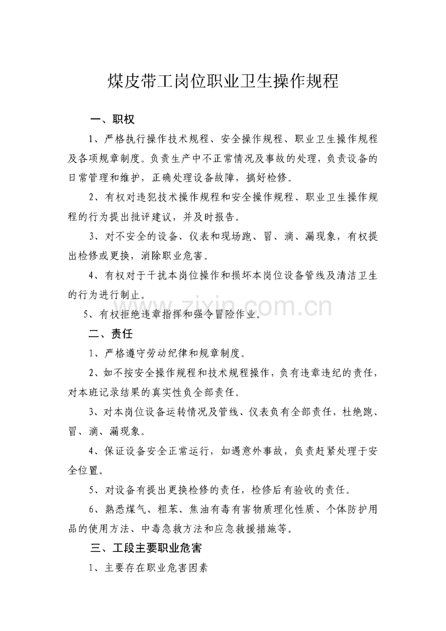 职业卫生操作规程编制单位:安全标准领导小组审核人:_批准人:_实施日期:_ 新泰正大量化嗑限公司煤皮带工岗位职业卫生操作规程一、职权1、严格执行操作技术规程、安全操作规程、职业卫生操作规程 及各项规章制度。负责生产中不正常情况及事故的处理,负责设备的 日常管理和维护,正确处理设备故障,搞好检修。2、有权对违犯技术操作规程和安全操作规程、职业卫生操作规 程的行为提出批评建议,并及时报告。3、对不安全的设备、仪表和现场跑、冒、滴、漏现象,有权提 出检修或更换,消除职业危害。4、有权对于干扰本岗位操作和损坏本岗位设备管线及清洁卫生 的行为进行制止。5、有权拒绝违章指挥和强令冒险作业。二、责任1、严格遵守劳动纪律和规章制度。2、如不按安全操作规程和技术规程操作,负有违章违纪的责任,对本班记录结果的真实性负全部责任。3、对本岗位设备运转情况及管线、仪表负有全部责任,杜绝跑、冒、滴、漏现象。4、保证设备安全正常运行,如遇意外事故,负责赶紧处理于安 全位置。5、对设备有提出更换检修的责任,检修后有验收的责任。6、熟悉煤气、粗苯、焦油有毒有害物质理化性质、个体防护用 品的使用方法、中毒急救方法和应急救援措施等。三、工段主要职业危害1、主要存在职业危害因素在煤线走廊主要有害成份是煤尘和噪声对人体存在危害。2、有害物质工业卫生允许值:名称工业卫生允许值(mg/nf)检测结果(mg/m3)煤尘4名称卫生限值dB(A)检测结果dB(A)噪声9 1四、职业卫生操作规程1、操作工在操作时必须严格遵守劳动纪律,坚守岗位,服从管 理,正确佩带和使用劳动防护用品。2、对生产现场经常性进行检查,及时消除现场中跑、冒、滴、漏现象,降低职业危害。3、当物料发生泄漏时,应立即控制泄漏进行通风,并及时回收 和清理。4、按时巡回检查所属设备的运行情况,不得随意拆卸和检修设 备,发现问题及时找专业人员修理。5、生产现场必须保持通风良好,在有毒有害岗位不得进餐;工 作完毕立即洗手,工作服勤洗勤换。6、生产现场及所属设备、管道经常保持无积水,无油垢,无灰 尘,不跑、冒、滴、漏,做到文明清洁生产。7、对加煤和下灰、下集尘器操作时,按规程要求佩戴防尘口罩 和防毒面罩;注意站在风向的上风向。8、应经常在岗位进行喷水增湿,减少粉尘危害。3焦皮带工岗位职业卫生操作规程一、职权1、严格执行操作技术规程、安全操作规程、职业卫生操作规程 及各项规章制度。负责生产中不正常情况及事故的处理,负责设备的 日常管理和维护,正确处理设备故障,搞好检修。2、有权对违犯技术操作规程和安全操作规程、职业卫生操作规 程的行为提出批评建议,并及时报告。3、对不安全的设备、仪表和现场跑、冒、滴、漏现象,有权提 出检修或更换,消除职业危害。4、有权对于干扰本岗位操作和损坏本岗位设备管线及清洁卫生 的行为进行制止。5、有权拒绝违章指挥和强令冒险作业。二、责任1、严格遵守劳动纪律和规章制度。2、如不按安全操作规程和技术规程操作,负有违章违纪的责任,对本班记录结果的真实性负全部责任。3、对本岗位设备运转情况及管线、仪表负有全部责任,杜绝跑、冒、滴、漏现象。4、保证设备安全正常运行,如遇意外事故,负责赶紧处理于安 全位置。5、对设备有提出更换检修的责任,检修后有验收的责任。6、熟悉煤气、粗苯、焦油有毒有害物质理化性质、个体防护用 品的使用方法、中毒急救方法和应急救援措施等。三、工段主要职业危害1、主要存在职业危害因素4在焦线主要有物焦尘、噪声等对人体存在危害。2、有害物质工业卫生允许值:名称工业卫生允许值(mg/nf)检测结果(mg/m3)焦尘8名称卫生限值dB(A)检测结果dB(A)噪声9 1四、职业卫生操作规程1、操作工在操作时必须严格遵守劳动纪律,坚守岗位,服从管 理,正确佩带和使用劳动防护用品。2、对生产现场经常性进行检查,及时消除现场中跑、冒、滴、漏现象,降低职业危害。3、当物料发生泄漏时,应立即控制泄漏进行通风,并及时回收 和清理。4、按时巡回检查所属设备的运行情况,不得随意拆卸和检修设 备,发现问题及时找专业人员修理。5、生产现场必须保持通风良好,在有毒有害岗位不得进餐;工 作完毕立即洗手,工作服勤洗勤换。6、生产现场及所属设备、管道经常保持无积水,无油垢,无灰 尘,不跑、冒、滴、漏,做到文明清洁生产。7、对加煤和下灰、下集尘器操作时,按规程要求佩戴防尘口罩 和防毒面罩;注意站在风向的上风向。8、应经常在岗位进行喷水增湿,减少粉尘危害。5装载机工岗位职业卫生操作规程一、职权1、严格执行操作技术规程、安全操作规程、职业卫生操作规程 及各项规章制度。负责生产中不正常情况及事故的处理,负责设备的 日常管理和维护,正确处理设备故障,搞好检修。2、有权对违犯技术操作规程和安全操作规程、职业卫生操作规 程的行为提出批评建议,并及时报告。3、对不安全的设备、仪表和现场跑、冒、滴、漏现象,有权提 出检修或更换,消除职业危害。4、有权对于干扰本岗位操作和损坏本岗位设备管线及清洁卫生 的行为进行制止。5、有权拒绝违章指挥和强令冒险作业。二、责任1、严格遵守劳动纪律和规章制度。2、如不按安全操作规程和技术规程操作,负