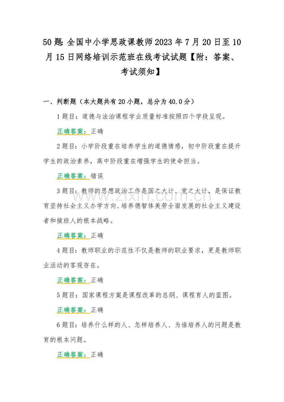 50题:全国中小学思政课教师2023年7月20日至10月15日网络培训示范班在线考试试题【附:答案、考试须知】