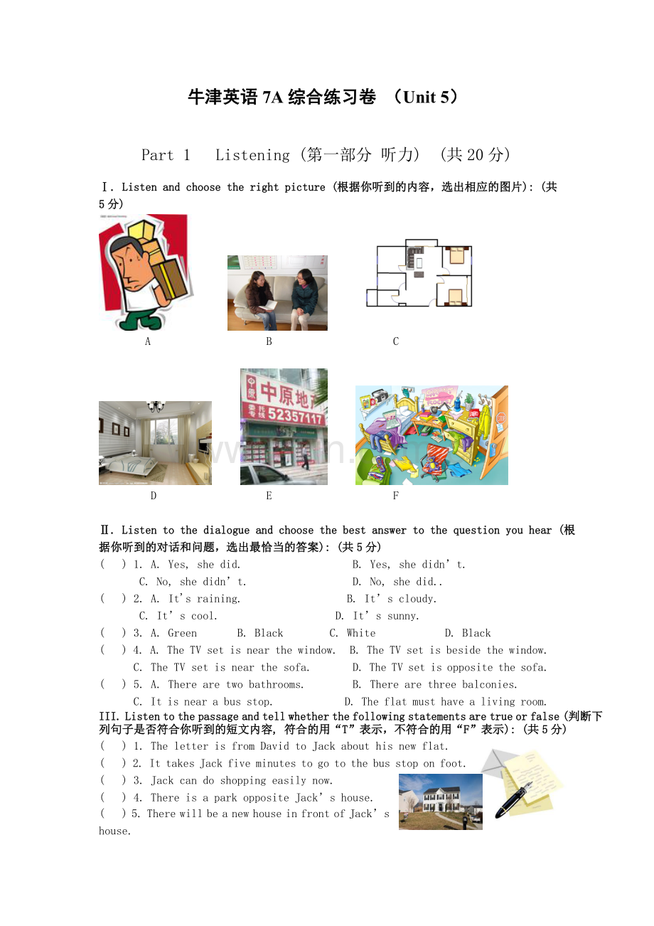 Ⅰ. Listen and choose the right picture (根据你听到的内容,选出相应的图片): (共5分)