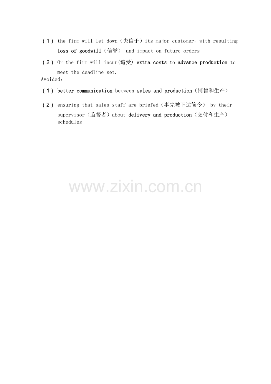 (2) ensuring that sales staff are briefed(事先被下达简令) by their supervisor(监督者)about delivery and production(交付和生产)schedules