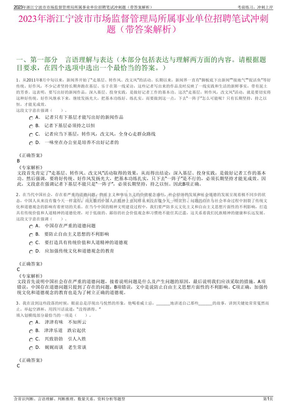2023年浙江宁波市市场监督管理局所属事业单位招聘笔试冲刺题(带答案解析)一、第一部分言语理解与表达(本部分包括表达与理解两方面的内容。请根据题目要求,在四个选项中选出一个最恰当的答案。)1、从2011年8月中旬以来,新闻界开始了“走基层、转作风、改文风”的活动。长期以来,新闻界一直有“脚板底下出新闻”“接地气”“捉活鱼”等好传统、好作风,不少记者坚持长期奔跑在基层、乐于在第一线采访,这些记者写出来的作品及时反映了一线实践和生活的新鲜事实,带有泥土的芳香。这表明,要写出好的新闻作品,深入基层、投身实践,是做好记者工作的基本功。这次“走基层,转作风,改文风”活动,就是要切实将这种好传统、好作风继承下来,继续发扬光大,把基本功练好、练扎实。而要做到这一点,下去“一阵子”怎么可能呢?只有长期坚持,持之以恒,才能见成效。这段文字意在强调()。A 记者只有下基层才能写出好的新闻作品 B 记者下基层必须持之以恒 C 记者应当下基层,转作风,改文风,全身心走群众路线 D 一味坐在办公室是培养不出好记者的正确答案B专家解析文段首先肯定了“走基层、转作风、改文风”活动取得的效果,从而得出结论:深入基层、投身实践,是做好记者工作的基本功。然后强调,要将好传统、好作风发扬光大,把基本功练扎实,只下去“一阵子”是不行的,必须长期坚持才能见成效。因此,文段意在强调记者下基层不能只是“一阵子”,必须长期坚持,持之以恒。因此B项正确。2、在当代中国社会,存在着严重的道德问题,物质主义和享乐主义的价值观念盛行,社会经济的发展和社会道德的发展呈现着极不同步的状态,中国人从来没有像今天一样富有,而无数的中国人在精神上也同样从来没有像今天一样贫穷。问题的存在与社会革命过程中割裂了传统文化和道德观念的影响有着密切的关系。在当今中国的精神文明建设过程中,我们要严防多元文化主义和自由主义思想片面性的不利影响,打造具有传统价值和人道精神的道德伦理,对于低级的、鄙俗的社会价值观念和习惯绝不能任其泛滥,这关系着我们民族精神的健康和长远发展。这段文字意在强调()。A 中国存在严重的道德问题 B 要防止自由主义思想的不利影响 C 要打造具有传统价值和人道精神的道德观 D 应加强传统文化和道德观念的教育正确答案C专家解析文段首先说明中国社会存在严重的道德问题,接着说明问题是什么及产生问题的原因,最后说明我们应该采取的措施。A项错误,中国存在道德问题只提到了存在的问题,B项错误,文中是说防止自由主义思想片面性的不利影响。C项正确,加强传统文化和道德观念的教育也是为了树立正确的道德观。3、我在读到这些段落的时候,眼前总是浮现出马悦然的形象,他喝着威士忌,_地讲述自己那些_的故事,讲到关键处常常戛然而止,举起空酒杯,用四川话说道:“没得酒得。”填入划横线部分最恰当的一项是()。A 津津有味不知所云 B 津津乐道跌宕起伏 C 兴致勃勃引人入胜 D 娓娓而谈老生常谈正确答案C2023年浙江宁波市市场监督管理局所属事业单位招聘笔试冲刺题(带答案解析)考前练习,冲刺上岸含常识判断、言语理解、判断推理、数量关系、资料分析等题型第1页专家解析BD两项错误,“津津乐道”中的“道”与“娓娓而谈”中的“谈”都含有说话的意思,与后面的“讲述”构成语义重复。第二空,与后文的“关键处”相对应,“引人入胜”,表示故事吸引人,符合句意。“不知所云”指说者语言紊乱或空洞,这样的故事一般不存在“关键处”。因此C项正确。4、理想是导航的罗盘,理想是不落的风帆。个人没有理想,便没有明确的方向,也不会有高昂的斗志;社会没有理想,便不知所进,变成一盘散沙。近代以来,积贫积弱、饱受欺凌的中华民族之所以能够浴血奋战、浴火重生,重新走上复兴之路,一个重要原因就在于其永不泯灭的复兴梦想,以及对复兴之路日趋深刻而明确的认识与把握,一句话:_。填入划横线部分最合适的一句是()。A 个人应该融入社会的洪流之中 B 她始终为美好的社会理想所感召、所引领 C 没有复兴就没有新中国 D 有梦想前途才一片光明正确答案B专家解析AC两项错误,文段谈的是中华民族走上复兴之路的原因在于其有复兴梦想。B项正确,文段论述理想谈到了个人理想和社会理想,中华民族的理想侧重于社会理想。D项错误,有梦想前途才一片光明,文段中提到的是“复兴梦想”而不是“梦想”。5、车轮质问方向盘说:“你为啥总是限制我的自由?”方向盘回答说:“随心所欲,是要滚到邪路上去的。”这段话的主旨()。A“不以规矩,无以成方圆”B 约束,所以才会自由 C 做坏事必须受到约束 D 天才成长需要有高人的指引正确答案A专家解析文段意在说明没有约束是不行的。A项正确,有“规矩”即约束,才可以“成方圆”;B项错误,与题中约束限制了自由意思相反;C项错误,不是因做坏事而约束,而是不约束可能做坏事;D项错误,高人指引天才的成长,属于引导,与约束无关。6、酒主要以液态形式存在,在古代缺乏严密容器的条件下是很难_保存的,因此出土的古酒就十分_。依次填入划横线部分最恰当的一项是()。A 长期罕见 B 完好珍贵 C 妥善难得 D 大量稀少正确答案A专家解析酒精容易挥发,再由文中信息“在古代缺乏严密容器的条件下”