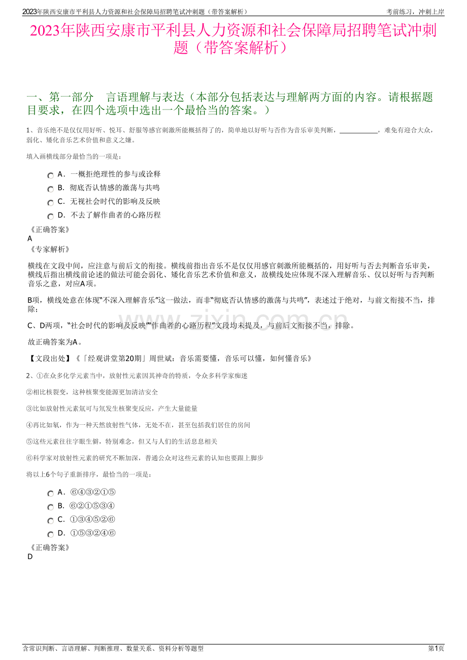 2023年陕西安康市平利县人力资源和社会保障局招聘笔试冲刺题(带答案解析)一、第一部分言语理解与表达(本部分包括表达与理解两方面的内容。请根据题目要求,在四个选项中选出一个最恰当的答案。)1、音乐绝不是仅仅用好听、悦耳、舒服等感官刺激所能概括得了的,简单地以好听与否作为音乐审美判断,难免有迎合大众,弱化、矮化音乐艺术价值和意义之嫌。填入画横线部分最恰当的一项是:A一概拒绝理性的参与或诠释 B彻底否认情感的激荡与共鸣 C无视社会时代的影响及反映 D不去了解作曲者的心路历程正确答案A专家解析横线在文段中间,应注意与前后文的衔接。横线前指出音乐不是仅仅用感官刺激所能概括的,用好听与否去判断音乐审美,横线后指出横线前论述的做法可能会弱化、矮化音乐艺术价值和意义,故横线处应体现不深入理解音乐、仅以好听与否判断音乐之意,对应A项。B项,横线处意在体现“不深入理解音乐”这一做法,而非“彻底否认情感的激荡与共鸣”,表述过于绝对,与前文衔接不当,排除;C、D两项,“社会时代的影响及反映”“作曲者的心路历程”文段均未提及,与前后文衔接不当,排除。故正确答案为A。【文段出处】经观讲堂第20期周世斌:音乐需要懂,音乐可以懂,如何懂音乐2、在众多化学元素当中,放射性元素因其神奇的特质,令众多科学家痴迷相比核裂变,这种核聚变能源更加清洁安全比如放射性元素氚可与氘发生核聚变反应,产生大量能量再比如氡,作为一种天然放射性气体,无处不在,甚至包括我们居住的房间这些元素往往字眼生僻,特别难念,但又与人们的生活息息相关科学家对放射性元素的研究不断加深,普通公众对这些元素的认知也要跟上脚步将以上6个句子重新排序,最恰当的一项是:A B C D正确答案D2023年陕西安康市平利县人力资源和社会保障局招聘笔试冲刺题(带答案解析)考前练习,冲刺上岸含常识判断、言语理解、判断推理、数量关系、资料分析等题型第1页专家解析对比选项,确定首句。首句分别为句和句,句指出在众多化学元素当中,放射性元素令众多科学家痴迷,引出“放射性元素”的话题,句指出科学家不断加深对放射性元素的研究,即科学家在“放射性元素”方面做出的努力,按照行文逻辑,应先引出话题之后再具体展开,故句应在句之前,句适合作首句,排除A、B两项。继续观察文段,句出现指代词“这种”,观察选项,句前分别是句和句,句提出放射性元素氚可与氘发生核聚变反应,涉及到“这种核聚变能源”内容,两句可以构成指代词捆绑。句指出一些元素与人们的生活息息相关,与“这种核聚变能源”无关,无法与句构成捆绑,排除C项。故正确答案为D。【文段出处】第九十九号元素锿基本化学性质首次揭示3、我国宏观调控体系伴随社会主义市场经济体制改革的全面深化不断创新、完善。随着大数据、云计算、人工智能、区块链等加速创新,数字技术日益融入经济社会发展各领域全过程。数字技术不仅是数字经济发展的支撑,而且是辅助经济治理的基础。宏观经济是一个不可中断的连续进程,作为关键生产要素的数据也是动态的、系统化的,以不间断的“流”的形式存在。发挥数字技术在宏观经济治理中的作用,是创新和完善调控的重要任务,是提高调控前瞻性、针对性、有效性的重要条件。这段文字是一篇文章的引言,接下去作者最可能讲述的是:A如何运用数字技术创新完善宏观调控 B如何完善宏观经济治理推动社会发展 C如何深度挖掘宏观经济数据资源 D如何让数字文明助力新发展格局正确答案A专家解析本题为接语选择题,需通读全文,重点把握文段核心话题。文段开篇引出话题,即宏观调控体系在不断创新、完善。随后提出数字技术对于经济治理的重要作用,并提出宏观经济与数据均是动态的形式存在。尾句提出数字技术对于宏观调控的重要作用。根据话题一致原则,文段接下来最可能围绕“数字技术”和“宏观调控”展开论述,介绍如何通过数字技术创新和完善宏观调控,对应A项。B、C、D三项,均未提及文段核心话题“数字技术”,与前文无法衔接,排除。故正确答案为A。【文段出处】善用数字技术创新宏观调控4、随着科技的发展,武器装备的智能化水平在不断提高,其对导航定位卫星的依赖程度也在不断提高,如果没有自己的导航卫星系统,在紧急情况下,一旦拥有导航定位卫星系统的国家关闭系统,性能再高的武器装备也无法发挥效能。比如,美国的GPS导航系统能够放出高精度的信号,也可以在必要时有选择地屏蔽信号,瘫痪对方的军事调动和高性能武器。华尔街日报就曾说过,如果发生冲突或紧急情况,“美国可能会断开GPS网络”。这段文字意在说明()。A 武器装备智能化的前提下,对导航定位卫星的依赖程度越来越高 B 建立独立的卫星导航系统,是避免在突发战争中受制于人,保证国家安全的命脉 C 在现代战争条件下,可靠的导航体系,是实现多兵种、跨地域协同作战的必要条件 D 美国的GPS导航系统占据着全球导航应用市场的绝对份额正确答案B专家解析文段首先介绍了“武器装备智能化的前提下,对导航定位卫星的依赖程度越来越高”的背景,接着提出论述重点“如果国家没有独立的卫星导航系统,将在突发战争中受制于人”,并以美国的GPS导航系统为例展开论证。因此B项正确。5、在生命科学领