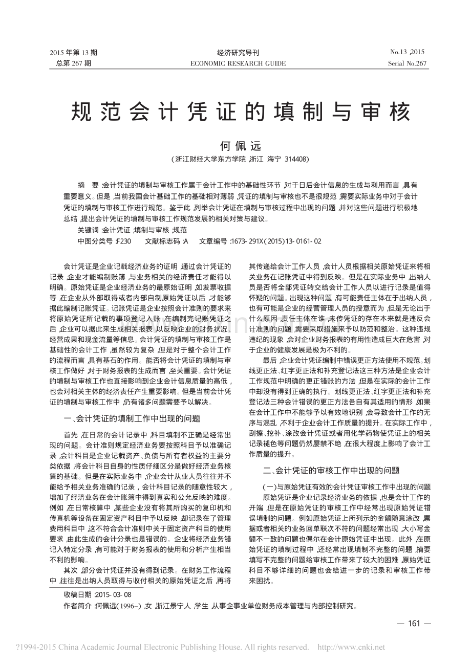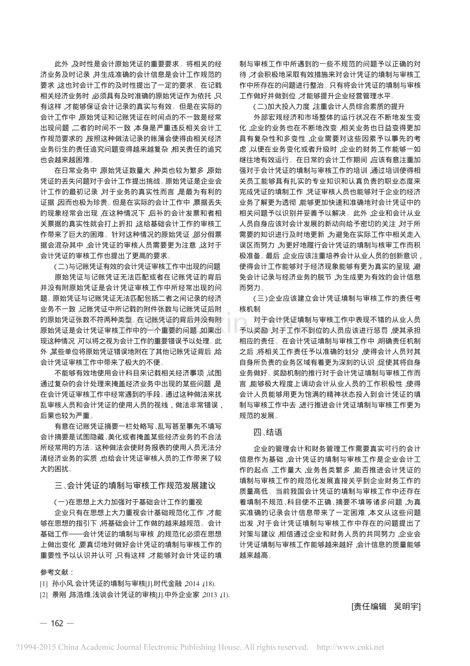 <p>会计凭证是企业记载经济业务的证明,通过会计凭证的记录,企业才能编制账簿,与业务相关的经济责任才能得以明确。原始凭证是企业经济业务的最原始证明,如发票收据等,在企业从外部取得或者内部自制原始凭证以后,才能够据此编制记账凭证。记账凭证是企业按照会计准则的要求来将原始凭证所记载的事项登记入账,在编制完记账凭证之后,企业可以据此来生成相关报表,以反映企业的财务状况、经营成果和现金流量等信息。会计凭证的填制与审核工作是基础性的会计工作,虽然较为复杂,但是对于整个会计工作的流程而言,具有基石的作用。能否将会计凭证的填制与审核工作做好,对于财务报表的生成而言,至关重要。会计凭证的填制与审核工作也直接影响到企业会计信息质量的高低,也会对相关主体的经济责任产生重要影响。但是当前会计凭证的填制与审核工作中,仍有诸多问题需要予以解决。一、会计凭证的填制工作中出现的问题首先,在日常的会计记录中,科目填制不正确是经常出现的问题。会计准则规定经济业务要按照科目予以准确记录,会计科目是企业记载资产、负债与所有者权益的主要分类依据,将会计科目自身的性质仔细区分是做好经济业务核算的基础。但是在实际业务中,企业会计从业人员往往并不能给予相关业务准确的记录,会计科目记录的随意性较大,增加了经济业务在会计账簿中得到真实和公允反映的难度。例如,在日常核算中,某些企业没有将其所购买的复印机和传真机等设备在固定资产科目中予以反映,却记录在了管理费用科目中,这不符合会计准则中关于固定资产科目的使用要求,由此生成的会计分录也是错误的。企业将经济业务错记入特定分录,有可能对于财务报表的使用和分析产生相当不利的影响。其次,部分会计凭证并没有得到记录。在财务工作流程中,往往是出纳人员取得与收付相关的原始凭证之后,再将其传递给会计工作人员,会计人员根据相关原始凭证来将相关业务在记账凭证中得到反映。但是在实际业务中,出纳人员是否将全部凭证转交给会计工作人员以进行记录是值得怀疑的问题。出现这种问题,有可能责任主体在于出纳人员,也有可能是企业的经营管理人员的授意而为,但是无论出于什么原因,责任主体在谁,未传凭证的存在本来就是违反会计准则的问题,需要采取措施来予以防范和整治。这种违规违纪的现象,会对企业财务报表的有用性造成巨大在危害,对于企业的健康发展是极为不利的。最后,企业会计凭证编制中错误更正方法使用不规范。划线更正法、红字更正法和补充登记法这三种方法是企业会计工作规范中明确的更正错账的方法,但是在实际的会计工作中却没有得到正确的执行。划线更正法、红字更正法和补充登记法三种会计错误的更正方法各自有其适用的情形,如果在会计工作中不能够予以有效地识别,会导致会计工作的无序与混乱,不利于企业会计工作质量的提升。在实际工作中,刮擦、挖补、涂改会计凭证或者用化学药物使凭证上的相关记录褪色等问题仍然屡禁不绝,在很大程度上影响了会计工作质量的提升。二、会计凭证的审核工作中出现的问题(一)与原始凭证有效的会计凭证审核工作中出现的问题原始凭证是企业记录经济业务的依据,也是会计工作的开端,但是在原始凭证的审核工作中经常出现原始凭证错误填制的问题。例如原始凭证上所列示的金额随意涂改,票据或者相关的业务回单联次不符的问题经常出现,大小写金额不一致的问题也偶尔在会计原始凭证中出现。此外,在原始凭证的填制过程中,还经常出现填制不完整的问题,摘要填写不完整的问题给审核工作带来了较大的困难,原始凭证科目不够详细的问题也会给进一步的记录和审核工作带来困扰。收稿日期:2 0 1 5-0 3-0 8作者简介:何佩远(1996-),女,浙江景宁人,学生,从事企事业单位财务成本管理与内部控制研究。规 范 会 计 凭 证 的 填 制 与 审 核何 佩 远(浙江财经大学东方学院,浙江 海宁 3 1 4 4 0 8)摘要:会计凭证的填制与审核工作属于会计工作中的基础性环节,对于日后会计信息的生成与利用而言,具有重要意义。但是,当前我国会计基础工作的基础相对薄弱,凭证的填制与审核也不是很规范,需要实际业务中对于会计凭证的填制与审核工作进行规范。鉴于此,列举会计凭证在填制与审核过程中出现的问题,并对这些问题进行积极地总结,提出会计凭证的填制与审核工作规范发展的相关对策与建议。关键词:会计凭证;填制与审核;规范中图分类号:F 2 3 0文献标志码:A文章编号:1 6 7 3-2 9 1 X(2 0 1 5)1 3-0 1 6 1-0 21 6 1此外,及时性是会计原始凭证的重要要求。将相关的经济业务及时记录,并生成准确的会计信息是会计工作规范的要求,这也对会计工作的及时性提出了一定的要求。在记载相关经济业务时,必须具有及时准确的原始凭证作为依托,只有这样,才能够保证会计记录的真实与有效。但是在实际的会计工作中,原始凭证和记账凭证在时间点的不一致是经常出现问题,二者的时间不一致,本身是严重违反相关会计工作规范要求的,按照这种做法记录的账簿会使得由相关经济业务衍生的责任追究问题变得越来越复杂,相关责任的追究也会越来越困难。在日常业务中,原始凭证数量大,种类也较为繁多,原始凭证的丢失问题对于会计工作提