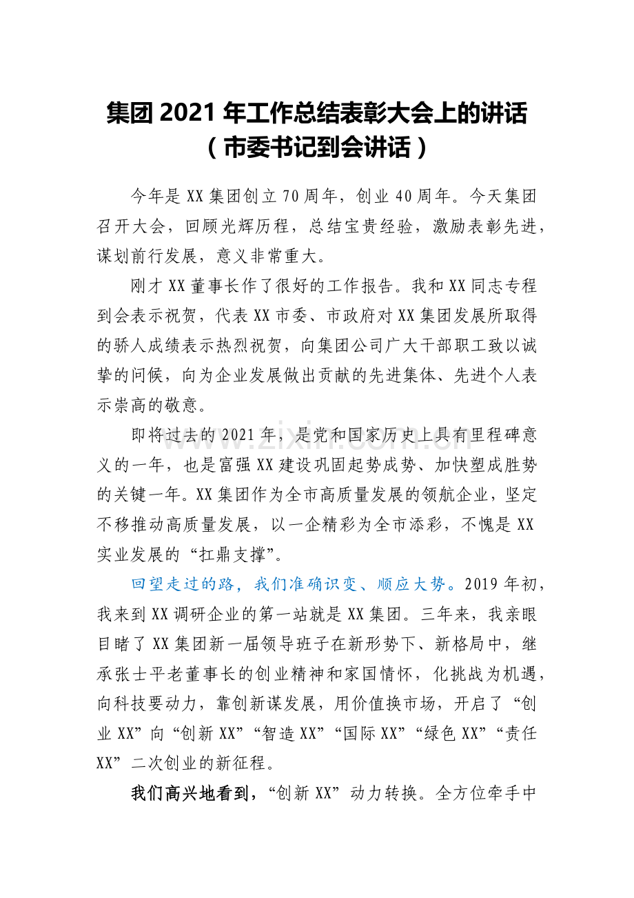集团2021年工作总结表彰大会上的讲话(市委书记到会讲话)
