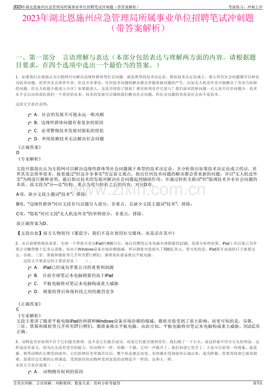 2023年湖北恩施州应急管理局所属事业单位招聘笔试冲刺题(带答案解析)一、第一部分言语理解与表达(本部分包括表达与理解两方面的内容。请根据题目要求,在四个选项中选出一个最恰当的答案。)1、如果我们乐观地认为互联网可以解决边缘性群体等社会问题,就是典型的技术决定论。假如技术决定论成立,那么所有社会问题都可以转化为技术问题,世界其实会简单许多,但这并非事实,任何技术问题的解决都会伴随着新问题的产生,比如无人机送外卖可能解决了劳动力短缺的问题,但无人机能不能进入小区?如果能进入,这是否侵犯了隐私?谁有权利允许它进入?我们面对的新问题一点儿也不比旧问题少。技术从不会自动承诺给我们一个更好的未来。技术的发展可以辅助我们解决社会问题,但社会问题的本质是社会而不是技术。这段文字意在说明:A社会的发展不可能永远一帆风顺 B边缘性群体问题有着复杂的原因 C必须警惕技术发展对隐私的侵犯 D单纯依赖技术无法解决社会问题正确答案D专家解析文段开篇指出认为互联网可以解决边缘性群体等社会问题属于典型的技术决定论,并分析指出如果技术决定论成立的话,世界其实会简单很多,接着通过“但这并非事实”否定前文观点,指出任何技术问题的解决都会带来新的问题,并以“无人机送外卖”为例进行解释说明,最后指出技术的发展对解决社会问题起到辅助作用,并通过转折关联词“但”强调技术并非社会问题的本质。故文段为“分总”结构,重点为尾句转折之后的内容,对应D项。A项,缺少文段主题词“技术”,排除;B项,“边缘性群体”对应文段首句话题引入部分,非重点,且缺少文段主题词“技术”,排除;C项,“隐私”对应文段“无人机送外卖”的举例部分,非重点,排除。故正确答案为D。【文段出处】南方人物周刊董晨宇:我们不是在使用社交媒体,而是活在其中2、从目前销售情况来看,全球一个季度可卖出iPad约400万台,接近同期笔记本电脑全球销量的1/10。美国分析师估算,iPad上市以来已为苹果公司赚得数十亿美元进账,而由于Windows设备市场份额缩减,所以微软市值损失了500亿美元。更可怕的是。iPad孤军奋战的日子就要过去,谷歌、三星、黑莓和微软等几乎所有IT巨鳄们,都排着队准备推出平板电脑。这段文字要表达的主要意思是()。A iPad已经成为苹果公司的重要利润源 B 目前全球笔记本电脑销量仍高于iPad C 平板电脑将对笔记本电脑构成重大威胁 D 销量的背后体现科技之间的激烈竞争正确答案C专家解析文段主要讲了随着平板电脑iPad的热销和Windows设备市场份额的缩减,微软市值受到了很大影响,而更可怕的是,谷歌、三星、黑莓和微软等几乎所有IT巨鳄们,都准备推出平板电脑。由此可知,平板电脑将对笔记本电脑构成重大威胁。因此C项正确。3、动物是否有权利不在于它们能否推理,也不是它们能否说话,而是它们能否感到受苦。我们踢了一下石头,说这样做不符合石头的利益,这样说没有意义,因为石头没有受苦的能力。但动物不一样。你踢一下猫,它叫一声跑开了,我们知道它受苦了。大家可以看到一些现象,就是猫、狗等动物在长期受到虐待,它们的神经非常痛苦以后,整个状态都会改变。有的猫在受到虐待后逃出来,成为野猫,你要再收留它就很困难,需要经过长期的心理调适。受到虐待的动物和受到宠爱的动物是不一样的,这和人一样。本段文字意在强调()。A 动物拥有权利的原因2023年湖北恩施州应急管理局所属事业单位招聘笔试冲刺题(带答案解析)考前练习,冲刺上岸含常识判断、言语理解、判断推理、数量关系、资料分析等题型第1页 B 人类要保护动物的权利 C 维护人权的必要性 D 人对动物有直接义务正确答案B专家解析文段是围绕动物的权利展开论述的,主要内容是在说动物应该享有权利的原因。B项正确,因为动物能感受痛苦,所以它们拥有权利,那么人类也要保护动物的权利。A项错误,动物拥有权力的原因仅仅是对文段的概述,题干中的“意在强调”是指要在文段意思的基础上有所推断。CD两项错误,维权和人对动物的直接义务在文中并没有涉及到。4、科学的本质是创新,那些变不可能为可能的发现,树立了科学史上一个又一个里程碑,比如19世纪有机尿素的合成,打破了“有机物只有靠动植物的生命力才能合成”的思想禁锢。但当我们自信能够通过合成超出自然的物质去战胜自然时,也应反思这些物质对健康、环境的反作用,毕竟它们改变着我们的衣食住行。这段文字意在说明()。A 不应过于迷信科技的作用 B 应对合成技术进行全面评估 C 应全面审视科技对人类及环境的影响 D 科技改变了人类的生活及人类的思维方式正确答案C专家解析C项正确,文段由转折词“但”引出主题句。概括可知,科技对人类产生正面作用的同时,也对环境等产生着反作用。即文段意在说明应全面审视科技对人类及环境的影响。AB两项,“迷信科技”、“合成技术”均是以偏概全;D项,科技改变了人类的生活及人类的思维方式不是文段意旨。5、下列各句中,没有歧义的一句是()。A 热爱人民的领袖 B 连我都不怕,你还怕他 C 那束花散发出一种轻微的香味 D 你是属狗的正确答案C专家解析A项错误,歧义在于是“人民的领袖被人热爱”还是“领袖热爱人民”。B项错误,的歧义在于“你连我都不怕,还怕他”或是“我都不
