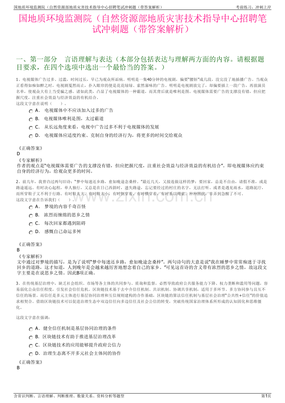 国地质环境监测院(自然资源部地质灾害技术指导中心招聘笔试冲刺题(带答案解析)一、第一部分言语理解与表达(本部分包括表达与理解两方面的内容。请根据题目要求,在四个选项中选出一个最恰当的答案。)1、电视媒体广告过多、过滥,时间过长,早已为观众所诟病。明明是一集40分钟的电视剧,偏要“腰斩”成几段,没完没了地插播广告。当观众正看得如痴如醉之时,电视剧戛然而止,扑入眼帘的便是花花绿绿、索然寡味的广告。明明是电视剧放完了,却偏要插上一段广告,再放演员名单,使观众大有上当受骗之感。诸如此类,凸显了电视媒体的一种霸道,而其背后就是唯利是图。电视媒体需要广告的支撑没有错,但应把握尺度,注重社会效益与经济效益的有机结合。这段文字意在说明()。A 电视媒体中不应该加入过多的广告 B 电视媒体唯利是图,太过霸道 C 从长远角度来看,电视中广告过多不利于电视媒体的发展 D 电视媒体应适度约束、克制自身的经济行为,将更多的时间交给观众正确答案D专家解析作者的观点是“电视媒体需要广告的支撑没有错,但应把握尺度,注重社会效益与经济效益的有机结合”。即电视媒体应约束自身的经济行为,给观众更多的时间。2、前几年,我曾诌过两句旧诗:“梦中每迷还乡路,愈如晚途念桑梓。”最近几天,又接连做这样的梦:要回家,总是不自由,请假不准,或是路途遥远。有时决心起程,单人独行,又总是在日已西斜时,迷失路途,忘记要经过的村庄的名字,无法打听。或者是遇见雨水,道路泥泞,而所穿鞋子又不利于行路。有时鞋太大,有时鞋太小,有时倒穿着,有时横穿着,有时系以绳索。种种困扰,非弄到急醒了不可。这段文字意在告诉我们()。A 梦境的内容千奇百怪 B 浓烈而缠绵的思乡之情 C 每次回家都遇到阻碍 D 感慨自己命运多舛正确答案B专家解析文中通过对梦境的描写,是为了说明“梦中每迷还乡路,愈如晚途念桑梓”。两句诗句的大意是说“我在睡梦中常常痴迷于寻找回乡的道路,这才知道,人到晚年是会越来越厉害地想念着自己的家乡。”可见这首诗的含义带有浓烈的思乡之情,故这段文字主要是在说思乡之情。因此B项正确。3、在传统基层治理中,缺乏社会组织、市场等各主体的共同参与、质询和监督,必然导致政府公共服务能力下降、权力垄断和滥用等问题,容易弱化公众信任程度,引发社会信任危机。区块链技术基于去中介信任机制、共识机制、协调共享机制,适用于多环节、多方协同参与且互不信任的场景。而信任是多元主体进行基层协同治理和互信规则建构的合作基础,区块链的算法信任机制与基层社会治理“公共性+信任”的价值追求相契合。借助区块链技术可以促进治理生态中双边信任向多边信任及社会公信的转变,突破传统国家治理体系所形成的认知固化和思维僵化。这段文字意在强调:A健全信任机制是基层协同治理的条件 B区块链技术有助于推进基层治理改革 C区块链技术的应用能够提升政府公信力 D治理生态离不开多元社会主体间的协作正确答案B国地质环境监测院(自然资源部地质灾害技术指导中心招聘笔试冲刺题(带答案解析)考前练习,冲刺上岸含常识判断、言语理解、判断推理、数量关系、资料分析等题型第1页专家解析文段开篇介绍传统基层治理中遇到的问题,即引发信任危机,接下来指出区块链适用于多环节、多方协同参与且互不信任的场景,并指出区块链的算法信任机制与基层社会治理“公共性+信任”的价值追求相契合,即可以将区块链技术用于基层治理中,尾句进一步强调区块链技术对于促进治理生态转变及突破传统国家治理体系中认知固化和思维僵化的作用,故文段旨在强调区块链技术对于基层治理的意义,对应B项。A项、D项,均缺少主题词“区块链技术”,排除;C项,缺少主题词“基层治理”,排除。故正确答案为B。【文段出处】区块链嵌入社会治理路径4、判断下列句子使用的修辞手法,正确的一项是()。(1)我到了自家的房外,我的母亲早已迎着出来了,接着便飞出了八岁的侄儿宏儿。(2)在这里,蓝天明月,秃顶的山,单调的黄土,浅濑的水,似乎都是最恰当不过的背景,无可更换。(3)微风过处,送来缕缕清香,仿佛远处高楼上渺茫的歌声似的。(4)宝剑锋从磨砺出,梅花香自苦寒来。A 比拟比喻比喻对偶 B 夸张排比通感对仗 C 比拟排比通感对偶 D 夸张比喻比喻对仗正确答案C专家解析(1)句,由“飞出了”可知,此句采用了拟物的手法。(2)句,“秃顶的山,单调的黄土,浅濑的水”采用了排比的手法。(3)句,把无声的嗅觉变为美妙的听觉,令人神往,为通感的手法。(4)句,为对偶。因此C项正确。5、对武器装备来说,没有永远的“明星”,只有彼此的“克星”,站在对手的角度,选准新装备的“克星”,才能让我们进一步 ,抢在对手之前探寻更先进武器装备的制胜机理,打造出 未来战场的坚甲利器。从这个意义上说,一个强劲的对手,既是改进武器的“”,也是研发武器的“催化剂”。依次填入画横线部分最恰当的一项是:A知己知彼 适应 磨刀石 B攻其不备 颠覆 指向标 C以逸待劳 引领 助推器 D战无不胜 胜任 源动力正确答案A专家解析第一空,根据横线前后“彼此的克星”“站在对手的角度”“抢在对手之前”可知,横线处要体现出站在对手的角度思考问题,了解对手想法,制造出更先进武器的含义,A项“知己