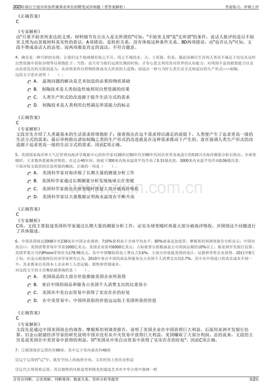 2023年浙江宁波市科协所属事业单位招聘笔试冲刺题(带答案解析)一、第一部分言语理解与表达(本部分包括表达与理解两方面的内容。请根据题目要求,在四个选项中选出一个最恰当的答案。)1、一部科幻电影史,记录了科学技术日新月异的发展,人工智能、量子力学、基因科技凡此种种,皆能在其中找到影像化的足迹。科学发展必然推动社会形态以不可思议的速度更新,随之产生的社会、伦理和道德问题等在科幻电影中也可管窥一二。无边的想象力在科学与哲学的双重加持下天马行空,科幻电影展示出人类在特定历史时期的心灵图景,以及面对这些前沿问题的尝试性思考。这段文字意在说明:A科幻电影带来科技以外的景象和思考 B贯穿在电影中的情感才是永恒的底色 C科学发展必然推动社会形态以不可思议的速度更新 D一部科幻电影史记录下了科学技术日新月异的发展正确答案A专家解析文段开篇指出科幻电影史记录了科学技术的发展,随后举“人工智能、量子力学”等例子进行解释说明,接下来通过“也”引导并列,指出在科幻电影中对社会、伦理和道德问题等也可管窥一二。尾句“在科学与哲学的双重加持下”对前文进行概括总结并得出结论,即科幻电影展示出人类的心灵图景及对前沿问题的思考,故文段为分总结构,重点在尾句,强调科幻电影展现人类心灵图景及思考,对应A项。B项,“电影”范围扩大,文段主要论述“科幻电影”,排除;C项,未提到文段的主题词“科幻电影”,排除;D项,“科学技术日新月异的发展”对应文段首句,非重点,排除。故正确答案为A。【文段出处】人民网记录时代的科幻电影(五洲茶亭)2、长城的文明是一种僵硬的雕塑,都江堰的文明却是一种_的生活。长城摆出一副老资格等待人们的修缮,都江堰却卑处一隅,像一位绝不炫耀、毫无所求的乡间母亲,只知_。填入划横线部分最恰当的一项是()。A 轻盈沉默 B 灵动贡献 C 滋润奉献 D 恬静付出正确答案B专家解析作者是拿长城与都江堰做对比,从而反衬出都江堰更胜一筹。CD两项错误,第一空,所填词语应该与“僵硬”构成反义相对关系。A项错误,“轻盈”一般是形容动作的,与“生活”搭配不当。因此B项正确。3、有人也许认为,“写文章只要不妨害所表达的义理,材料细节有点出入是无所谓的。”)义理是文章的灵魂,大凡写文章,不会不关注这一点。这种关注就应包含对支撑义理的材料的审慎核查与选用。对括号内的文字理解最准确的是()。A 批评了只重视表达义理,但是不重视材料真实性的错误认识 B 肯定了既重视义理的表达,也重视材料细节必须真实的主张 C 批评了借口不妨害表达义理,而忽视材料真实性的错误认识 D 肯定了材料对表达义理的作用,不主张苛求材料细节的真实2023年浙江宁波市科协所属事业单位招聘笔试冲刺题(带答案解析)考前练习,冲刺上岸含常识判断、言语理解、判断推理、数量关系、资料分析等题型第1页正确答案C专家解析由“只要不妨害所表达的义理,材料细节有点出入是无所谓的”可知,“不妨害义理”是“无所谓”的条件,说话人批评的是以不妨害义理为由忽视材料真实性的看法,A项错误,是转折关系,没有体现这种条件关系。BD两项错误,由“也许认为”可知,文段不赞成说话人的态度,而两项都是肯定的说法,不符合题意。4、确实是一种巧妙的安排,让我们这个地球拥有取之不尽,用之不竭的水、火、土资源。但是,藉此而赖以生存的人类决不满足于仅仅从这些自然资源中获取谷物等以填饱肚子。当然,也只有当他们远离饥饿的时候,才有心思去利用其对世界的认知能力,对周围丰富的联想能力以及由此迸发出的无限创造力,从而将某些自然物转换成为人所需的人造物,创造出一种与当时人类生活方式相适应的生产形式制陶。这段文字意在说明()。A 温饱问题的解决是艺术创造的必要的物质基础 B 制陶技术是人类创造性地利用自然资源的结果 C 人类生产形式的改进源于提升生活方式的需求 D 制陶技术是人类利用自然满足所需能力的标志正确答案C专家解析文段首先介绍了人类最基本的生活需求即填饱肚子;接着指出在这个需求得以满足的前提下,人类便产生了追求更高一级的生活方式的需求;最后举例指出诸如制陶之类的生产形式的改进就是在这种需求推动下产生的。意在强调人类生产形式的改进源于追求更高一级的生活方式的需求。因此C项正确。5、美国国家海洋和大气层管理局海洋学数据中心的科学家对20世纪50年代至90年代间在世界各地进行的510万次海洋测量分析后指出,全球变暖时,大多数热量被海洋吸收。在过去40年间,海底下300米内海水温度平均升高了0.31摄氏度,3000米内水温平均升高0.06摄氏度。下面对短文提供的信息所做的概括,正确的一项是()。A 美国科学家对海洋做了长期大量的测量分析工作 B 美国科学家通过长期测量分析发现地球正在变暖 C 美国科学家指出全球变暖时热量大部分被海洋吸收 D 美国科学家以大量数据证明海水温度在不断升高正确答案C专家解析C项,文段主要叙述美国科学家通过长期大量的测量分析工作,证实全球变暖时热量大部分被海洋吸收,并围绕这个问题进行了具体描述。6、中国美国商会2008年对238家在中国企业调查,710%获利高于全球平均水平,80%准备追加投资。摩根斯坦利调查报告分析显示:中国对美出口,