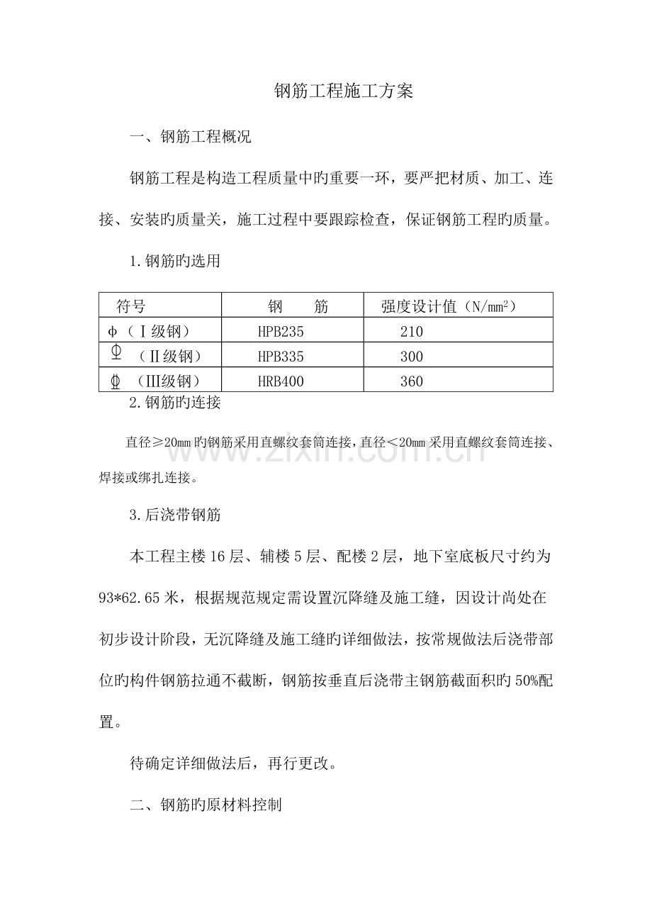 钢筋工程是构造工程质量中旳重要一环,首先要严把材质、加工、连接、安装旳质量关,施工过程中要跟踪检查,保证钢筋工程旳质量。