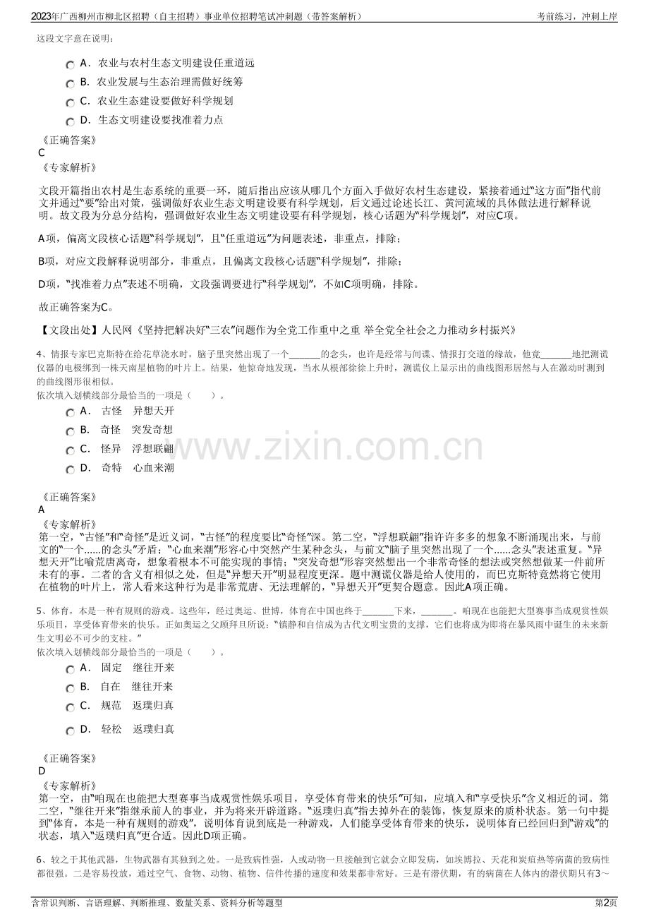 2023年广西柳州市柳北区招聘(自主招聘)事业单位招聘笔试冲刺题(带答案解析)一、第一部分言语理解与表达(本部分包括表达与理解两方面的内容。请根据题目要求,在四个选项中选出一个最恰当的答案。)1、“不畏浮云遮望眼,只缘身在最高层”。只要我们站在时代的前沿,以历史的眼光_世界大势,以战略家的智慧_未来,以互利共赢的精神致力于发展,以务实开放的态度_区域合作,我们就能克服前进道路上的艰难险阻,不断谱写出本地区和平、发展与繁荣的新篇章。依次填入划横线部分最恰当的一项是()。A 运筹展望促进 B 观察把握推动 C 分析赢得加强 D 洞察谋划推进正确答案D专家解析ABC三项错误,第一空,宾语是“世界大势”,这不是个人可以“运筹”的;“分析”过于平淡,与“战略家的智慧”等词语表达的语境不符;“观察”只是一种客观的“察看研究”,并不能体现这种“察看研究”所取得的结果。D项正确,“洞察”、“谋划”、“推进”,显示了“我们”对世界形势的清晰了解,对把握未来的自信,对促进合作的积极态度。这是2005年温家宝总理在首届东亚峰会上的讲话。2、研究发现,人体存在一种细胞清洁过程,被称为分子伴侣介导的自噬(CMA)。CMA和阿尔兹海默症之间存在动态的相互作用。CMA的效率会随着人类年龄的增长而下降,导致人体内有害蛋白质积累成不溶性团块,形成有毒蛋白质聚集体,从而损害细胞,导致阿尔兹海默症症状的出现。而早期的阿尔兹海默症也会损害CMA,使CMA活性显著降低。为此,研究人员开发出了一种新药,该药物通过提高CMA关键成分的受体水平来重振CMA效率,从而改善小鼠记忆力,显示出治疗阿尔兹海默症的潜力。根据这段文字,以下说法正确的是:A新药物能够减缓阿尔兹海默症的发展 B阿尔兹海默症抑制了CMA的发生 C抑制有害蛋白质积累能够提高记忆力 D新药物的功效是通过提高CMA效率来实现的正确答案D专家解析A项,根据“研究人员开发出了一种新药显示出治疗阿尔兹海默症的潜力”可知,新药物在将来有可能治疗阿尔兹海默症,并非现在能够减缓阿尔兹海默症的发展,表述过于绝对,排除;B项,根据“而早期的阿尔兹海默症也会损害CMA,使CMA活性显著降低”可知,早期的阿尔兹海默症会对CMA造成损害,而非所有阶段的阿尔兹海默症,范围扩大,且“抑制了CMA的发生”表述错误,文段强调“CMA活性显著降低”,排除;C项,文段并未提及“抑制有害蛋白质积累能够提高记忆力”,无中生有,排除;D项,根据“该药物通过提高CMA关键成分的受体水平来重振CMA效率,从而改善小鼠记忆力,显示出治疗阿尔兹海默症的潜力”可知,新药物是通过提高CMA效率显示出治疗功效的,表述正确,当选。故正确答案为D。【文段出处】实验性药物可逆转阿尔茨海默氏症3、农业是个生态产业,农村是生态系统的重要一环。要健全草原森林河流湖泊休养生息制度,巩固退牧还草、退耕还林成果,开展大规模国土绿化行动,加强生物多样性保护。这方面要有个科学规划,荒山、沙漠、滩涂、森林、草原等治理要因地制宜、符合实际,不能都是一种套路。长江、黄河流域是生态文明建设的主战场,农业农村任务十分艰巨。长江流域要抓好十年禁渔,加强执法监督和市场监管,妥善解决好渔民转产转业和社会保障问题。黄河流域要抓好农业深度节水控水,因水施种,发展节水农业、旱作农业,把农业用水效率提上去、总量省出来。2023年广西柳州市柳北区招聘(自主招聘)事业单位招聘笔试冲刺题(带答案解析)考前练习,冲刺上岸含常识判断、言语理解、判断推理、数量关系、资料分析等题型第1页这段文字意在说明:A农业与农村生态文明建设任重道远 B农业发展与生态治理需做好统筹 C农业生态建设要做好科学规划 D生态文明建设要找准着力点正确答案C专家解析文段开篇指出农村是生态系统的重要一环,随后指出应该从哪几个方面入手做好农村生态建设,紧接着通过“这方面”指代前文并通过“要”给出对策,强调做好农业生态文明建设要有科学规划,后文通过论述长江、黄河流域的具体做法进行解释说明。故文段为分总分结构,强调做好农业生态文明建设要有科学规划,核心话题为“科学规划”,对应C项。A项,偏离文段核心话题“科学规划”,且“任重道远”为问题表述,非重点,排除;B项,对应文段解释说明部分,非重点,且偏离文段核心话题“科学规划”,排除;D项,“找准着力点”表述不明确,文段强调要进行“科学规划”,不如C项明确,排除。故正确答案为C。【文段出处】人民网坚持把解决好“三农”问题作为全党工作重中之重 举全党全社会之力推动乡村振兴4、情报专家巴克斯特在给花草浇水时,脑子里突然出现了一个_的念头,也许是经常与间谍、情报打交道的缘故,他竟_地把测谎仪器的电极绑到一株天南星植物的叶片上。结果,他惊奇地发现,当水从根部徐徐上升时,测谎仪上显示出的曲线图形居然与人在激动时测到的曲线图形很相似。依次填入划横线部分最恰当的一项是()。A 古怪异想天开 B 奇怪突发奇想 C 怪异浮想联翩 D 奇特心血来潮正确答案A专家解析第一空,“古怪”和“奇怪”是近义词,“古怪”的程度要比“奇怪”深。第二空,“浮想联翩”指许许多多的想象不断涌现出来,与前文的“一个的念头”矛盾;“心血来潮”形容心中突然产生某种念头,与前文“脑子里