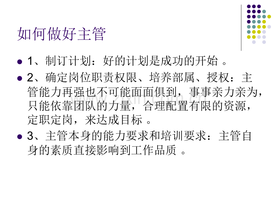 管理培训管理培训如何做好主管 l1、制订计划:好的计划是成功的开始。l2、确定岗位职责权限、培养部属、授权:主管能力再强也不可能面面俱到,事事亲力亲为,只能依靠团队的力量,合理配置有限的资源,定职定岗,来达成目标。l3、主管本身的能力要求和培训要求:主管自身的素质直接影响到工作品质。好的计划是成功的开始好的计划是成功的开始 1.凡事先制订计划,预先确定要做哪些事、如何做、何时做、由谁做、何时完成、谁监督(P阶段)。2.按计划实施(D阶段),在实施过程中对计划监控和调整。3.计划包括:年度计划、季度计划、月度计划、周计划。计划监控和调整计划监控和调整 计划监控:加强对计划的监控工作,强调计划监控的主要方法。透过PDCA的循环,不断达成目标。计划监控的主要方法计划监控的主要方法.事前监控:由于这种监控方法注意的是目前还没有发生的未来行为,进行这种监控,可事先采取预防性的行动。.事中监控:在计划执行过程中,要强调执行力,这也是做好主管要考虑的重要因素,计划了一大堆,如果不去执行或是执行效果不彰,就达不到目的,所以要时时按照衡量标准来检查工作,确定行与不行。(C阶段).事后监控:将执行结果与期望的标准相比较,看其是否符合标准,总结经验教训,并制定改进行动措施,以利于将来的行动。(A阶段同时又是下一个P阶段的开始)确定岗位职责权限、培养部属、确定岗位职责权限、培养部属、授权授权 做一个优秀主管必须要善于培养下属,下属的能力提升从而也会带动整个部门效率、绩效的提升。包括对下属多方面能力的有计划性培训,使下属成为多能工,但又分别精于某一项或几项职能。合理的授权方式,有利于提高工作效率,促进目标的实现。员工激励:适当的员工激励是做好工作必不可少的因素之一,包括物质的、精神的(可采取奖金、派外受训等多种方式)优秀主管必须要善于培养下属优秀主管必须要善于培养下属 做一个优秀主管必须要善于培养下属,下属的能力提升从而也会带动整个部门效率、绩效的提升。包括对下属多方面能力的有计划性培训,使下属成为多能工,但又分别精于某一项或几项职能。明确岗位责任后,主管勇于承担个人责任,还要确定职位代理。善于启发下属,鼓励下属独立完成作业,多发掘问题,对于问题的解决也要按PDCA的步骤来进行。强调进行思想教育,重点是对企业文化的理解。合理的授权方式合理的授权方式有利于提高工作效率有利于提高工作效率 授予下属适当的决策权,使其在计划和管理中有一定的自主性。这样,既能增强下属的责任心,从而调动下属的积极性和创造性,又能使主管集中精力考虑部门整体规划。以确保整体目标为目的:授权的全部目的,乃在于鼓励下属为实现总目标而分担更多一些的责任。分权而不放任:分权后,还要尽力发挥其综合才能,将分散的成果构成一个整体。掌握有效的监控方法:分权后,应当时时纵观全局计划的进展情况,对可能出现的偏离目标的局部现象进行协调,对被授权者实行必要的监督和控制。主管本身的能力要求和培训主管本身的能力要求和培训要求:主管自身的素质直接要求:主管自身的素质直接影响到工作品质影响到工作品质。主管本身的能力要求主管本身的能力要求 l1.能力和技能。l2.个人价值观:十分正直,能公正地评价所有的人和组织。l3.进取精神:有充沛的精力,很强的领导动机,它是建立在自信心基础上的对权力和成就的迫求。l4.协调、沟通能力:任何组织都包含着许多子系统,各子系统之间彼此矛盾、冲突、促进、关联、抗拒、吸引,在组织的活动过程中发生交互作用。这就需要通过协调、沟通,使各种力量和行为统一于为实现组织共同目标而努力的方向上来。l5.决策能力。能力和技能能力和技能 a.思维敏捷,相当强的分析能力,良好的判断力,以及能从战略上、全局上考虑问题的能力等;b.很强的人际交往能力,能迅速建立起良好的工作关系,感情投入,有说服力,注重对人与人之间的了解。c.声誉和工作记录:在公司主要活动中,有很高的声望和出色的工作记录。决策能力决策能力 a.ISO八大原理的运用:b.用人原则:敢用有缺点的人重用有主见的人敢用比自己强的人摒弃人好恶重视个人素质培训要求培训要求 l1.掌握行业和企业知识。l2.掌握所在岗位的专业知识。掌握行业和企业知识掌握行业和企业知识 a.掌握广泛的行业知识(市场、竞争、产品、技术);b.广泛了解公司情况(主要领导人及其成功原因、公司文化、历史、制度)。