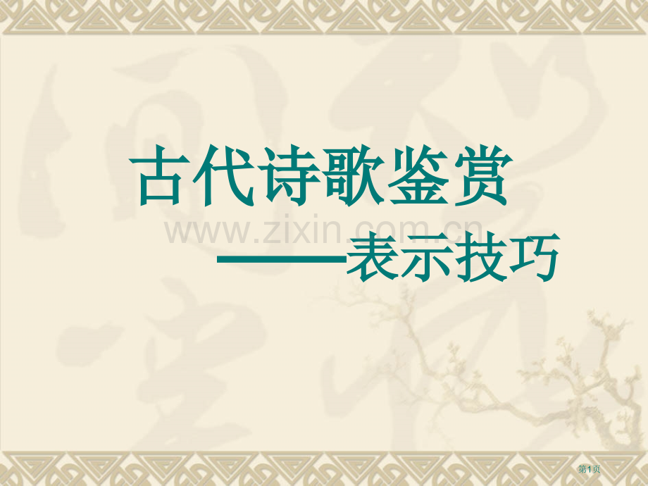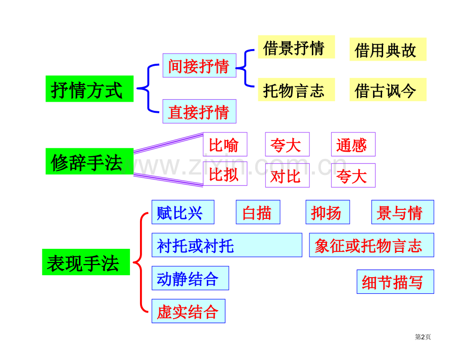 古代诗歌鉴赏古代诗歌鉴赏 表示技巧表示技巧第1页表现手法表现手法赋比兴赋比兴衬托或衬托衬托或衬托动静结合动静结合虚实结合虚实结合景与情景与情细节描写细节描写象征或托物言志象征或托物言志白描白描抑扬抑扬抒情方式抒情方式直接抒情直接抒情间接抒情间接抒情借景抒情借景抒情托物言志托物言志借用典故借用典故借古讽今借古讽今修辞手法修辞手法比喻比喻通感通感比拟比拟夸大夸大夸大夸大对比对比第2页(一)抒情方式分析(一)抒情方式分析 在抒情方式上,有直抒胸臆、间接抒情,在抒情方式上,有直抒胸臆、间接抒情,间接抒情间接抒情多为多为借景抒情、托物言志、借用典故、借古喻今等。借景抒情、托物言志、借用典故、借古喻今等。1、直接抒情、直接抒情登幽州台歌登幽州台歌 陈子昂陈子昂前不见古人,后不见来者。念天地之悠悠,独怆然而涕下。前不见古人,后不见来者。念天地之悠悠,独怆然而涕下。【析】【析】诗句开门见山,诗句开门见山,直叙直叙登上高台后登上高台后“前不见古前不见古人人,后不见来者后不见来者”怆凉意境怆凉意境,这意境引发了诗人感,这意境引发了诗人感时伤事情怀,想着天地悠悠之大,而人之渺小,不时伤事情怀,想着天地悠悠之大,而人之渺小,不禁禁“独怆然而涕下独怆然而涕下”。第3页2、间接抒情、间接抒情(1)借景抒情)借景抒情 王维送元二使安西王维送元二使安西“渭城朝雨浥轻尘,客舍青青柳渭城朝雨浥轻尘,客舍青青柳色新。劝君更进一杯酒,西出阳关无故人。色新。劝君更进一杯酒,西出阳关无故人。”“朝雨朝雨”“柳柳色色”除了写春色外,还表示了哪些言外之意?除了写春色外,还表示了哪些言外之意?答:答:“朝雨朝雨”还衬托出诗人送别友人时还衬托出诗人送别友人时忧伤之情忧伤之情;“杨柳杨柳”象征离别象征离别,折柳相赠表示留恋之情,增加了浓厚离别情,折柳相赠表示留恋之情,增加了浓厚离别情意。意。绝句二首绝句二首 杜甫杜甫江碧鸟逾白,山青花欲燃。今春看又过,何日是归年。江碧鸟逾白,山青花欲燃。今春看又过,何日是归年。【析】【析】全诗抒发了羁旅异乡感叹,诗人全诗抒发了羁旅异乡感叹,诗人借清新美好春光景色借清新美好春光景色描写描写,透露出了思归感伤透露出了思归感伤,以乐景写哀情。,以乐景写哀情。第4页(2)托物言志)托物言志 蝉蝉 虞世南虞世南垂绥垂绥ru饮清露,流响出疏桐。饮清露,流响出疏桐。居高声自远,非是藉秋风。居高声自远,非是藉秋风。【析】【析】诗中三四句诗中三四句借蝉声远传借蝉声远传独特感受,道出了独特感受,道出了蕴含真理,也就是蕴含真理,也就是立身品格高洁立身品格高洁人,不需要某种人,不需要某种外在凭借,自能声名远播,从而表示出对人内在外在凭借,自能声名远播,从而表示出对人内在品格热情赞颂和高度自信。品格热情赞颂和高度自信。第5页(3)借用典故。)借用典故。古今人们用典方式各种多样,普通古今人们用典方式各种多样,普通采取采取明用、暗用、正用明用、暗用、正用和和反用反用四种方式。四种方式。a、明用典故、明用典故 古典诗词在使用典故时,假如能使读者从字面一古典诗词在使用典故时,假如能使读者从字面一看便知使用了某个典故就是明用典故。这种现象在看便知使用了某个典故就是明用典故。这种现象在古典诗词中是常见,如苏轼江城子古典诗词中是常见,如苏轼江城子密州出猎:密州出猎:“持节云中,何日遣冯唐持节云中,何日遣冯唐?”这是明用史记这是明用史记冯唐冯唐列传中故事,东坡居士在这里明用这个典故,意列传中故事,东坡居士在这里明用这个典故,意在以魏尚自况,希望有一个象冯唐那样识才敢谏之在以魏尚自况,希望有一个象冯唐那样识才敢谏之人,为自己在宋神宗面前保荐,派人将自己召回,人,为自己在宋神宗面前保荐,派人将自己召回,委以重担。这是古人忧国忧民忧患意识反应。委以重担。这是古人忧国忧民忧患意识反应。第6页b、暗用典故、暗用典故 古典诗词在使用典故时,有时表面上古典诗词在使用典故时,有时表面上看,用典处似乎与上下文句融合为一,不看,用典处似乎与上下文句融合为一,不细察则不知为用典,这就是暗用典故。比细察则不知为用典,这就是暗用典故。比如江城子如江城子密州出猎末句是:密州出猎末句是:“会挽雕会挽雕弓如满月,西北望,射天狼弓如满月,西北望,射天狼。”表面看来表面看来好象是写好象是写“出猎出猎”,描写猎人弯弓射狼情,描写猎人弯弓射狼情况。其实这是暗用了楚辞况。其实这是暗用了楚辞东君东君“举长举长矢兮射天狼矢兮射天狼”典故。天狼,是星名,古代典故。天狼,是星名,古代用以代表贪残掠夺,作者在此代指辽和西用以代表贪残掠夺,作者在此代指辽和西夏统治者;夏统治者;“射天狼射天狼”则表明自己御敌保则表明自己御敌保国决心。国决心。第7页c、正用典故、正用典故 李白宣州谢眺楼饯别校书叔云中有李白宣州谢眺楼饯别校书叔云中有“蓬莱文蓬莱文章建安骨,中间小谢又清发章建安骨,中间小谢又清发。”以典代人,经过文以典代人,经过文章既以赞李云,也以自赞。章既以赞李云,也以自赞。“蓬莱蓬莱”,为海中神山,为海中神山名,传说仙府中难得典籍,均藏于此。