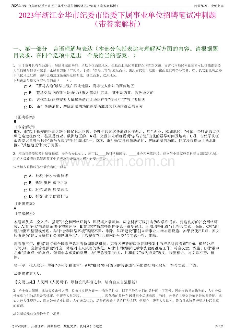 2023年浙江金华市纪委市监委下属事业单位招聘笔试冲刺题(带答案解析)一、第一部分言语理解与表达(本部分包括表达与理解两方面的内容。请根据题目要求,在四个选项中选出一个最恰当的答案。)1、由于茶叶具有帮助消化,解除油腻的功能,所以不仅西藏地区,包括西北地区畜牧群众均喜欢饮茶,而古代内地民间役使和军队征战都需要大量的骡马但供不应求,正好西部地区产良马。于是,“茶马互市”便应运而生。因此古代很早以前,在西北就有茶马交易。起于长安的丝绸之路不仅仅只运丝绸,茶叶也通过这条道路运往西北,甚至西亚、欧洲地区。下列说法与原文内容相符的是()。A“茶马古道”最早出现在西北地区,而非世人熟知的西南地区 B 茶马交易中的茶叶是通过丝绸之路运往西北,甚至是西亚、欧洲地区的 C 古代军队征战需要大量骡马是西北地区产生“茶马互市”的主要原因 D 茶叶帮助消化、解除油腻的功能深受西藏及其他地区群众的喜爱正确答案B专家解析B项,由“起于长安的丝绸之路不仅仅只运丝绸,茶叶也通过这条道路运往西北,甚至西亚、欧洲地区。”可知,茶叶是通过丝绸之路运往西北,甚至是西亚、欧洲地区的。A项,文段并未明确说明“茶马古道”出现的最早时间及地点。C项,古代军队征战需要大量骡马只是“茶马互市”产生的原因之一。D项,茶叶确实具有帮助消化、解除油腻的功能,但文段仅提及了西北地区,“其他地区”扩大了范围。2、应急科普能够及时解疑释惑,提升公众认知力,还可以 伪科学和谣言,社会和网络环境。建立健全国家应急科普协调联动机制,完善各级政府应急管理预案中的应急科普措施,极为必要,更是 。依次填入画横线部分最恰当的一项是:A批驳 净化 未雨绸缪 B抵制 维护 重中之重 C对抗 清理 居安思危 D拆穿 建设 防微杜渐正确答案A专家解析本题可从第二空入手,搭配“社会和网络环境”,且根据文意可知,应急科普可以打击伪科学和谣言,营造良好的社会网络环境,A项“净化”指清除杂质使物体纯净,B项“维护”指维持保护使免于遭受破坏,两项均搭配得当且符合文意,保留。C项“清理”指彻底整理或处理,与“社会和网络环境”搭配不当,排除;D项“建设”指创立新事业、增加新设施,如果要使用D项,原文应表述为“建设良好的社会和网络环境”,直接搭配“社会和网络环境”与文意不符,排除。再看第三空,根据“建立健全国家应急科普协调联动机制,完善各级政府应急管理预案中的应急科普措施”可知,横线处应与“机制、应急管理预案”对应,体现对未来风险的防范,A项“未雨绸缪”比喻事先做好准备工作,符合文意,保留。B项“重中之重”指重点中的重点,强调非常重要的意思,与“应急预案”无关,且和前文“极为必要”语义、程度相近,与文意不符,排除。第一空,代入验证,搭配“伪科学和谣言”,A项“批驳”指对错误的言论或行为加以批判和驳斥,符合文意,当选。故正确答案为A。【文段出处】人民网人民网评:厚植公民科普之种,培育自立自强根基3、哈士奇太闹腾、比特犬攻击性太强、拉布拉多很友好狗狗的性格,似乎已经和它们的品种画上了等号。因此在选择宠物狗时,人们会格外在意它们的品种是否纯正。但研究人员发现,。现代狗的品种在19世纪中后期出现,当时,犬类的主要划分依据是体型特征,比如大丹犬体型巨大,而吉娃娃娇小玲珑。人们通常认为,品种代表着犬类的行为特征,但现在,研究人员认为,没有什么迹象表明这种联系真的存在。填入画横线部分最恰当的一项是:2023年浙江金华市纪委市监委下属事业单位招聘笔试冲刺题(带答案解析)考前练习,冲刺上岸含常识判断、言语理解、判断推理、数量关系、资料分析等题型第1页 A不同品种的狗在行为上有很大差异 B犬类的行为变化可以用品种来解释 C不能根据狗的品种来预测它的行为 D狗的攻击性可能与遗传没什么关系正确答案C专家解析横线出现在文段中间,需结合前后文内容进行分析。横线前交待了“人们认为宠物狗的品种和性格、行为有关系”。横线后先阐述人们通常的观点,即犬类的品种代表着其行为特征,后又通过转折词“但”强调犬类的品种与其行为特征的联系不存在。横线前出现转折词“但”,故横线处所填内容与前文相反,即“宠物狗的品种和性格、行为无关”,且该内容也能承接后文。C项“不能根据狗的品种来预测它的行为”,与文意相符,当选。A项,文段讨论“是否可以通过宠物狗的品种来判断行为”,并非讨论不同品种的狗的行为是否有很大差异,偏离文段核心话题,排除;B项,“行为变化可以用品种来解释”与文意相悖,文段强调品种与行为无关,排除;D项,文段并未提及“遗传”,无中生有,排除。故正确答案为C。【文段出处】光明网狗的行为与品种关系不大4、事实上,任何一个不可避免的灾害原本就是社会人口因素与生态系统中潜在的破坏性因素相结合的产物。就舟曲泥石流而言,人类活动的_和社会管理的_显然是灾害的要素之一。但在地质专家们看来,这些原因还远不足以将舟曲之灾_为人祸之故。依次填入划横线部分最恰当的一项是()。A 加速疏忽断言 B 破坏漏洞归咎 C 频繁忽略断定 D 加剧疏漏妄定正确答案D专家解析A项错误,第一空,“加速”修饰“人类活动”不妥。CD两项错误,第二空,“忽略”是指疏忽,没注意到;
