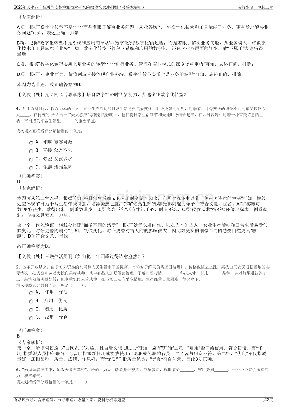 2023年天津市产品质量监督检测技术研究院招聘笔试冲刺题(带答案解析)一、第一部分言语理解与表达(本部分包括表达与理解两方面的内容。请根据题目要求,在四个选项中选出一个最恰当的答案。)1、王祁咏竹诗“叶垂千口剑,干耸万条枪”,可谓深得古诗对仗和中国传统语言意境之美,但聪明的苏东坡却以一句戏评曲终奏雅:诗是好诗,但竹子太差,十根才一叶耳!金岳霖少年时就发现传统谚语“金钱如粪土,朋友值千金”实在有违逻辑,照此推理便是朋友如粪土。或许我们的传统文化一般都不会这么较真,但偶尔来这么一下,要么带来东坡似的黑色幽默,要么启发了天才逻辑学家的少年天赋。这段话主要支持了这样一个观点,即()。A 中国传统文化如果细品,大多经不起较细致的逻辑推敲 B 中国传统文化独一无二的魅力恰好就在于它的模糊美 C 习惯了传统文化的模糊美后,“较真”一下会收到奇效 D 传统文化应当在逻辑严密性方面加强,使人较真不得正确答案C专家解析A项错误,文段并没有表现对传统文化的批判;B项错误,“传统文化的模糊美”不能由文段推出,且没有体现对传统文化“较真”后得到的效果;C项正确,文段首先列举两个例子,最后说明文段的观点,即“偶尔对传统文化较真一下,会带来另外的效果”;D项错误,“使人较真不得”表述错误,“偶尔来这么一下”说明有时还是可以对传统文化“较真”的,而且并不是所有的传统文化都不严密。2、司马迁心胸开阔,不带成见,是个严格的史学家,而不是儒教的提倡者,在议题上他采取_的态度。他极度崇敬孔子,但他不是个_的孔门信徒。他所描绘的孔子是个人,而不是个圣人。填入划横线部分最恰当的一项是()。A 客观虔诚 B 开放盲从 C 中立狭隘 D 宽容狂热正确答案C专家解析“心胸开阔,不带成见,是个严格的史学家”是指司冯迁在写史时不偏不倚,忠于史实的态度,故第一空填入“客观”或“中立”较合适。“虔诚”指恭敬而有诚意,前文说“他极度崇敬孔子”,后文如果说“他不是个虔诚的孔门信徒”,则前后文意矛盾,所以第二空不能填“虔诚”。因此C项正确。3、企业数字化转型并不是为了数字化而数字化,其核心在于价值创造。对企业而言,价值创造直接体现在业务端,数字化转型实质上是业务的转型,是在以技术为支点、业务为内核的新一代数字技术驱动下,进行业务、管理和商业模式的深度变革重构。因此,数字化转型不是系统和应用简单从“非数字化”到“数字化”的过程,而是着眼于解决业务问题,从业务切入,将数字化技术和工具赋能于业务,更有效地解决业务问题。对这段文字,理解不准确的是()。A企业数字化转型离不开数字化技术和工具的支持 B系统和应用数字化不属于企业数字化转型的要求 C企业数字化转型本质是革新业务、管理和商业模式 D只有落脚到业务上,企业才能真正实现数字化转型正确答案B2023年天津市产品质量监督检测技术研究院招聘笔试冲刺题(带答案解析)考前练习,冲刺上岸含常识判断、言语理解、判断推理、数量关系、资料分析等题型第1页专家解析A项,根据“数字化转型不是而是着眼于解决业务问题,从业务切入,将数字化技术和工具赋能于业务,更有效地解决业务问题”可知,表述正确,排除;B项,根据“数字化转型不是系统和应用简单从非数字化到数字化的过程,而是着眼于解决业务问题,从业务切入,将数字化技术和工具赋能于业务”可知,数字化转型不仅包含系统和应用的数字化,还包含业务层面的转型,故“不属于”表述错误,当选;C项,根据“数字化转型实质上是业务的转型进行业务、管理和商业模式的深度变革重构”可知,表述正确,排除;D项,根据“对企业而言,价值创造直接体现在业务端,数字化转型实质上是业务的转型”可知,表述正确,排除。本题为选非题,故正确答案为B。【文段出处】光明网【思享家】培育数字经济时代新能力,加速企业数字化转型4、处于农耕时代、以农为本的古人,农业生产活动和日常生活易受气候变化、时令更替的制约,对季节、月令变换的细微不同的感受远较今人 。在传统的“天人合一”“天人感应”等观念的影响下,他们将日常生活细节和天地时令结合起来,在四时流转中过着一种审美诗意的生活,节日成为平常生活里 的重要节点。依次填入画横线部分最恰当的一项是:A细腻 寥寥可数 B直接 念念不忘 C强烈 孜孜以求 D敏感 熠熠生辉正确答案D专家解析本题可从第二空入手,根据“他们将日常生活细节和天地时令结合起来,在四时流转中过着一种审美诗意的生活”可知,横线处应体现节日为平常生活带来诗意,增添美感之意,D项“熠熠生辉”形容光彩闪耀的样子,符合文意,保留。A项“寥寥可数”形容很少,数得出来,侧重数量少,B项“念念不忘”形容牢记于心,时刻不忘,C项“孜孜以求”指不知疲倦地探求,侧重勤勉,均与文意无关,排除。第一空,代入验证,横线处搭配“细微不同的感受”,根据“处于农耕时代、以农为本的古人,农业生产活动和日常生活易受气候变化、时令更替的制约”可知,气候变化、时令更替对古人的的影响很大,因此对变换的细微不同的感受自然更为“敏感”,D项符合文意,当选。故正确答案为D。【文段出处】三联生活周刊如何把一年四季过得诗意盎然?5、改革开放以来,由于对外贸易的发展和人民生活水平的提高,